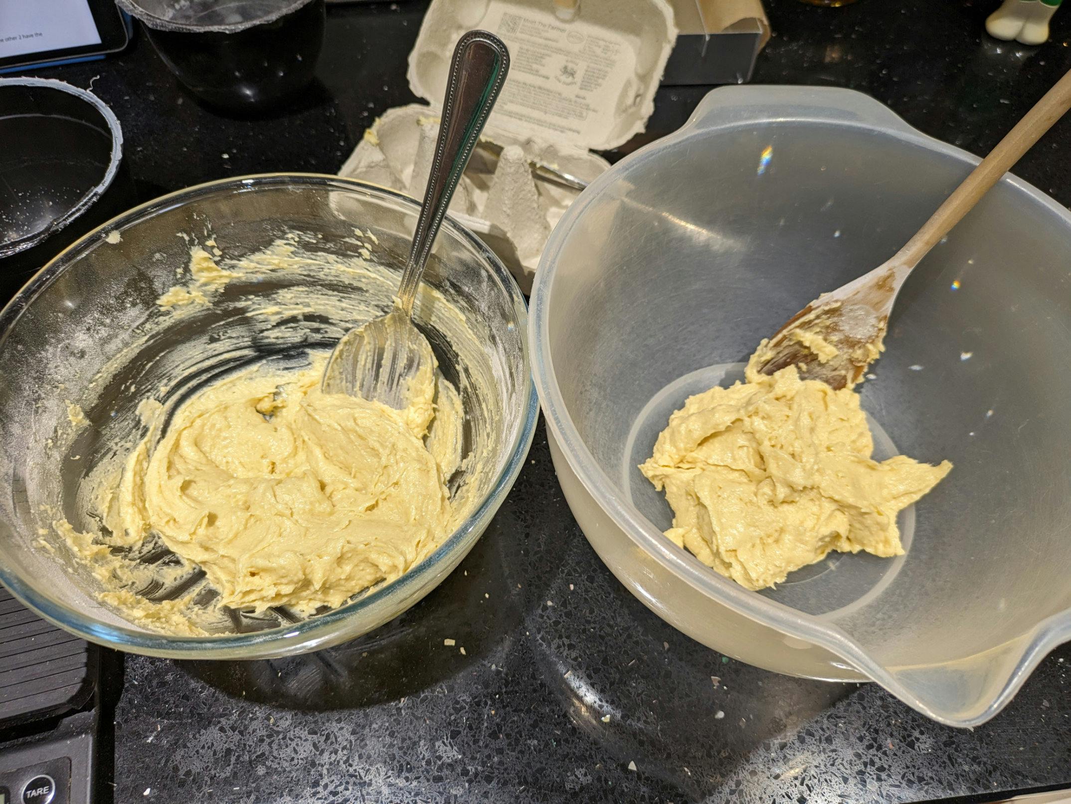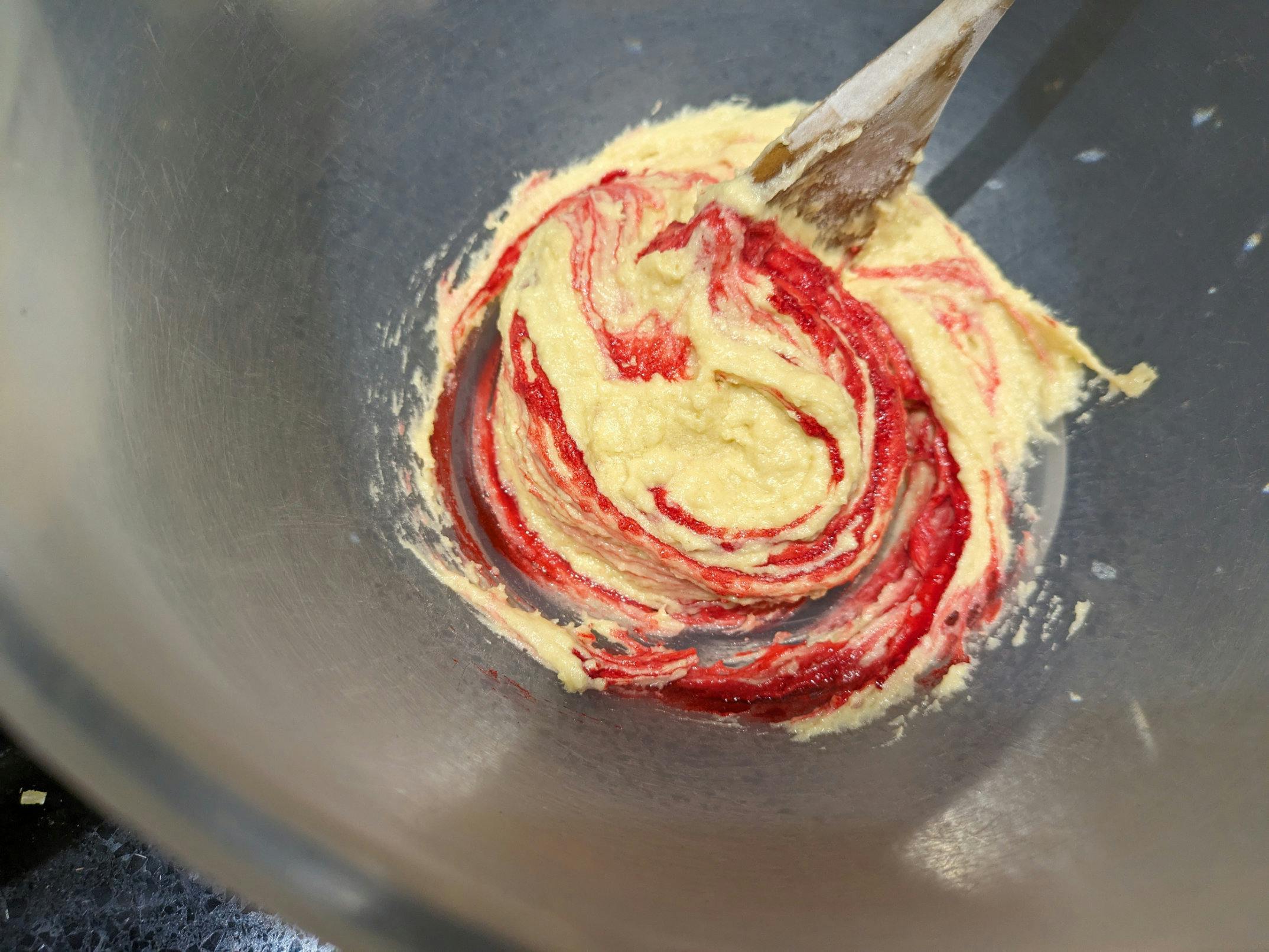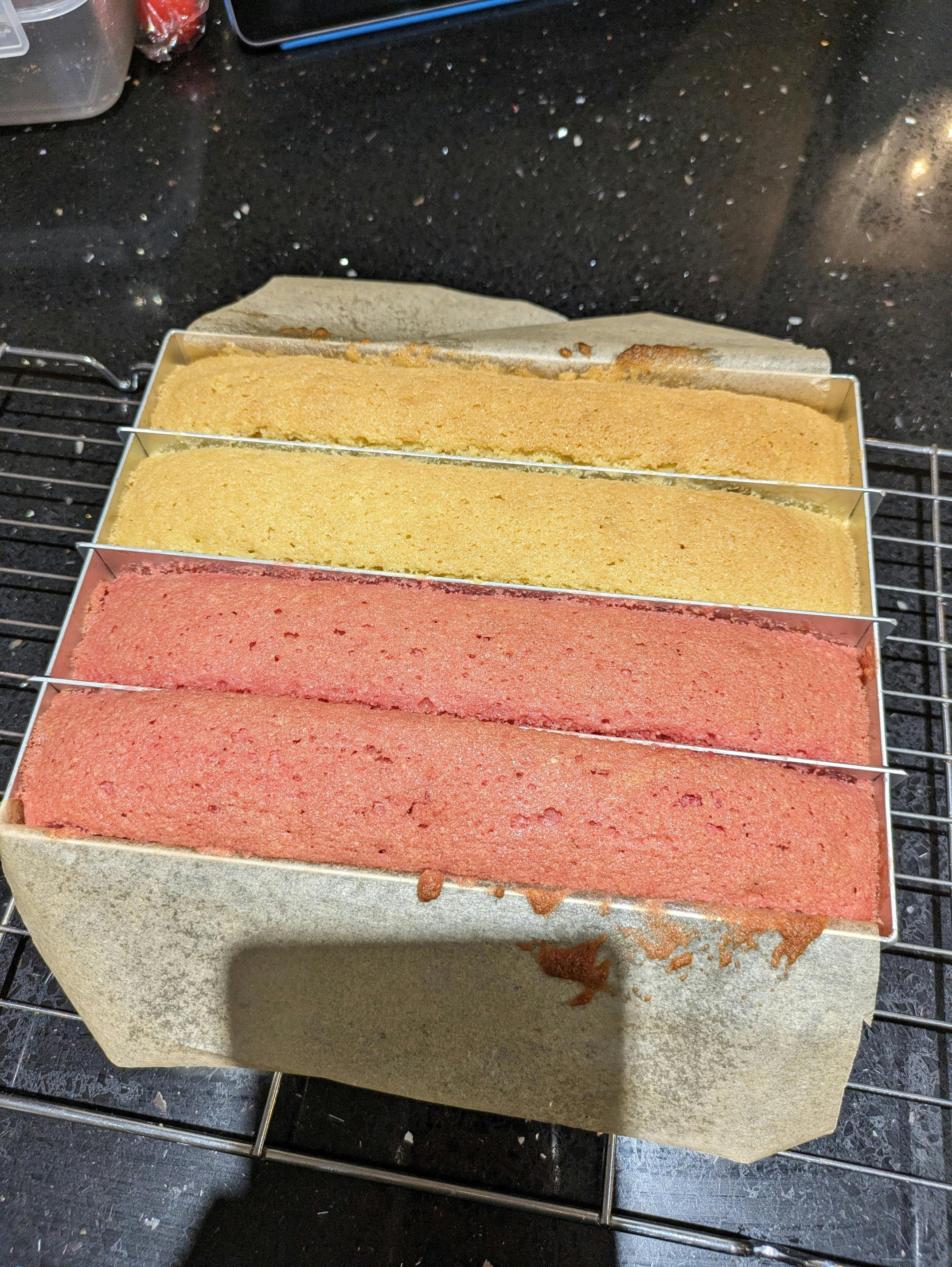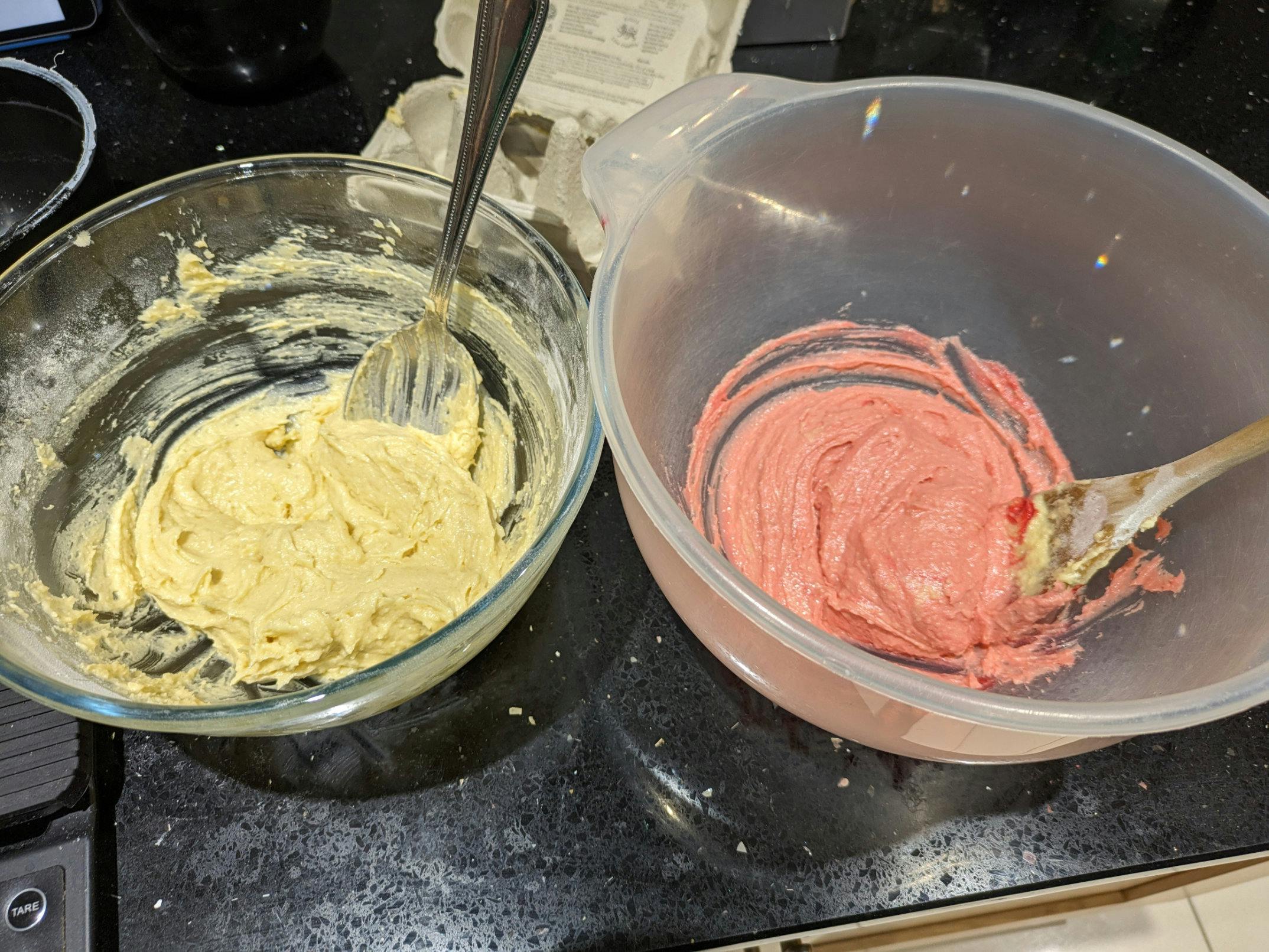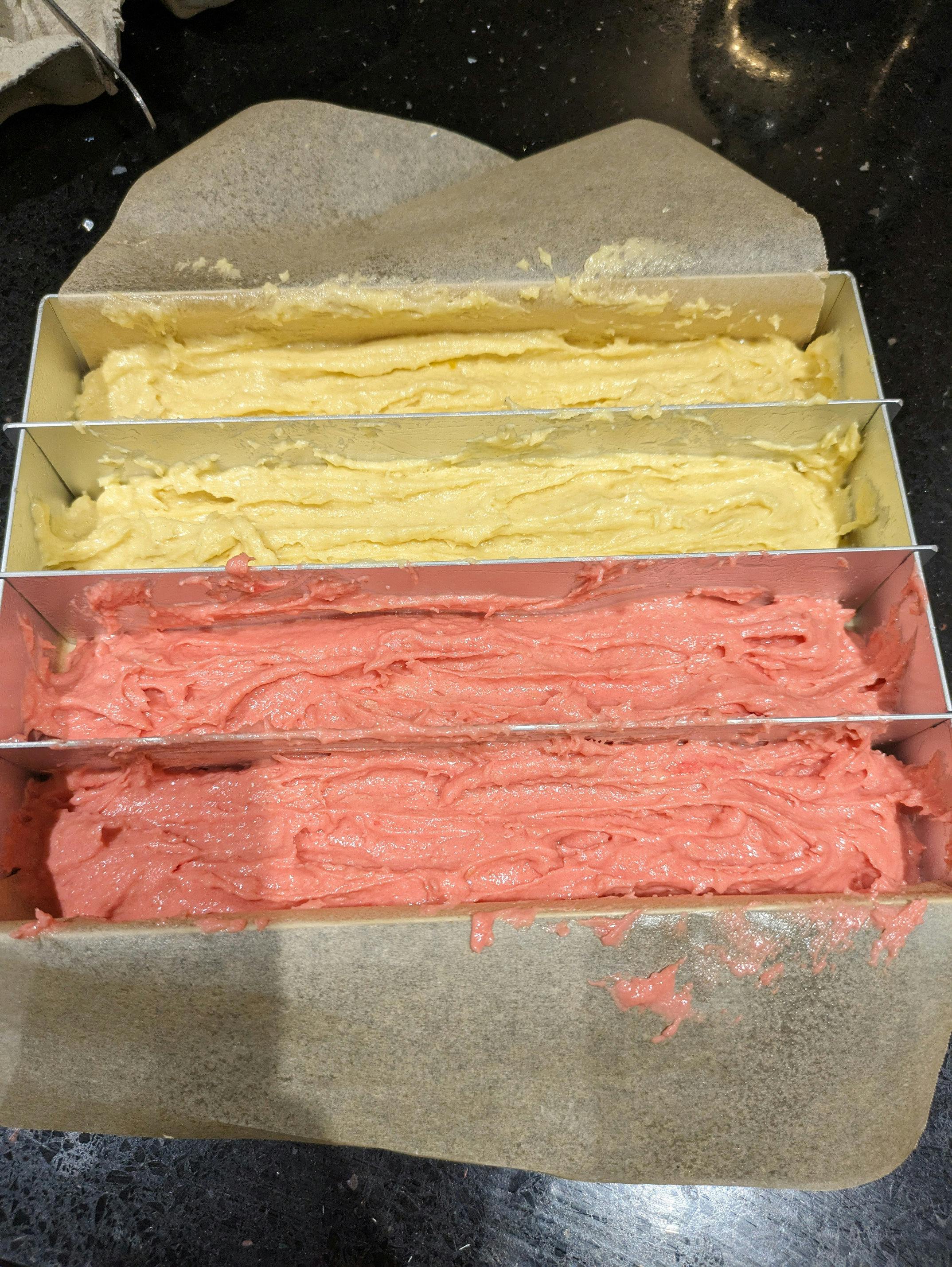 Spoon the mixture into the tin so that 2 of the sections have the pink mixture and the other 2 have the non-coloured mixture, and level