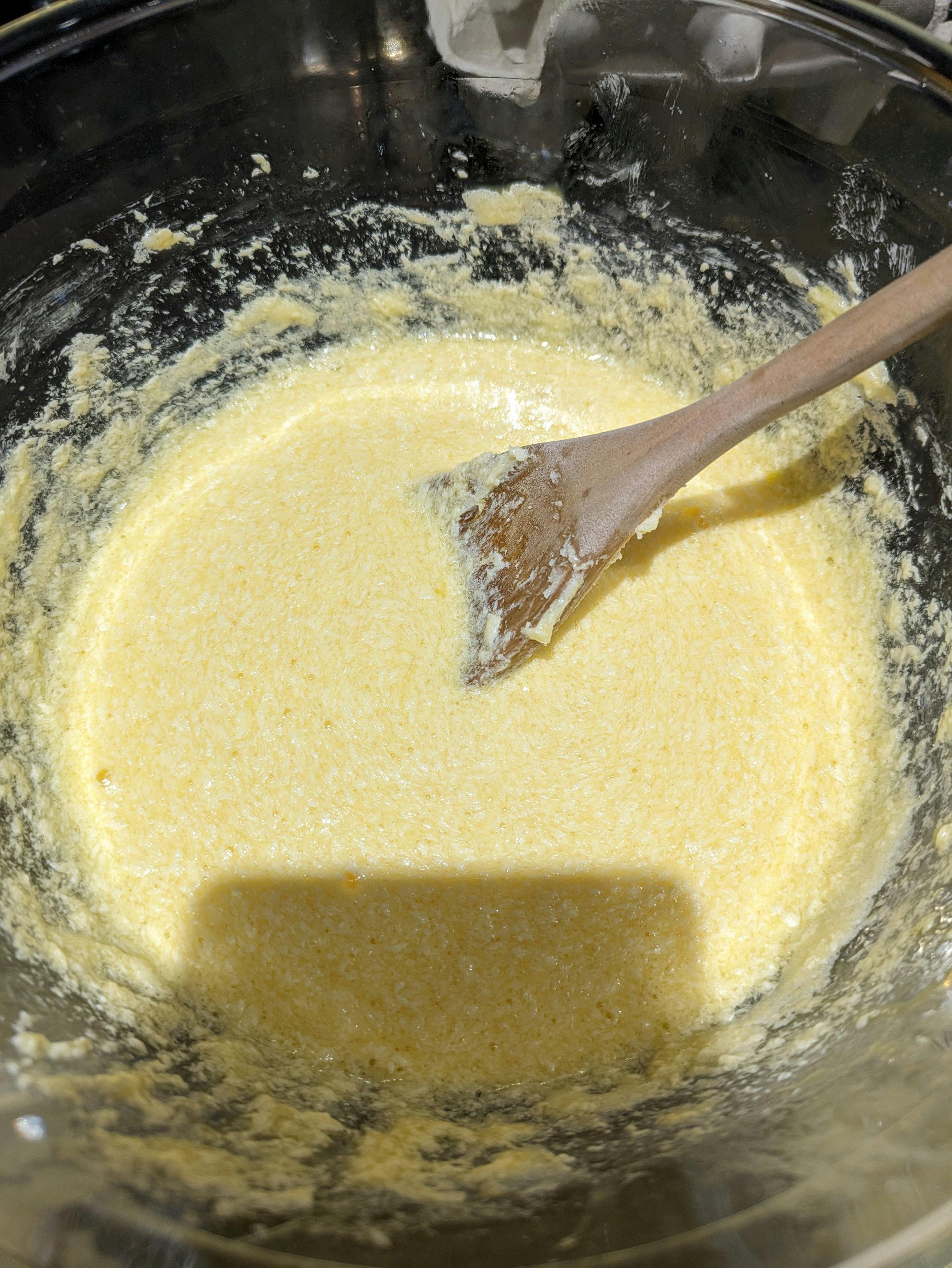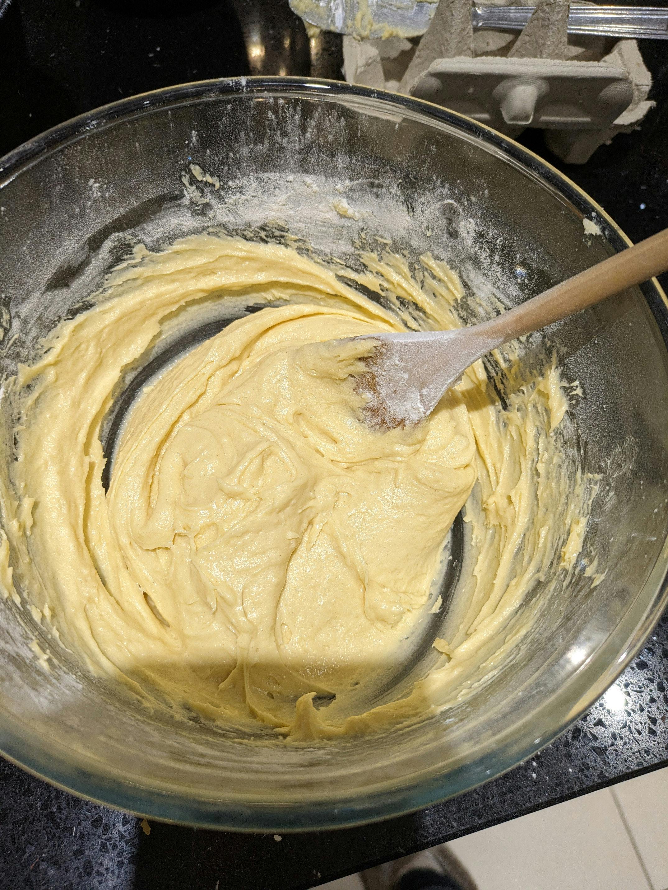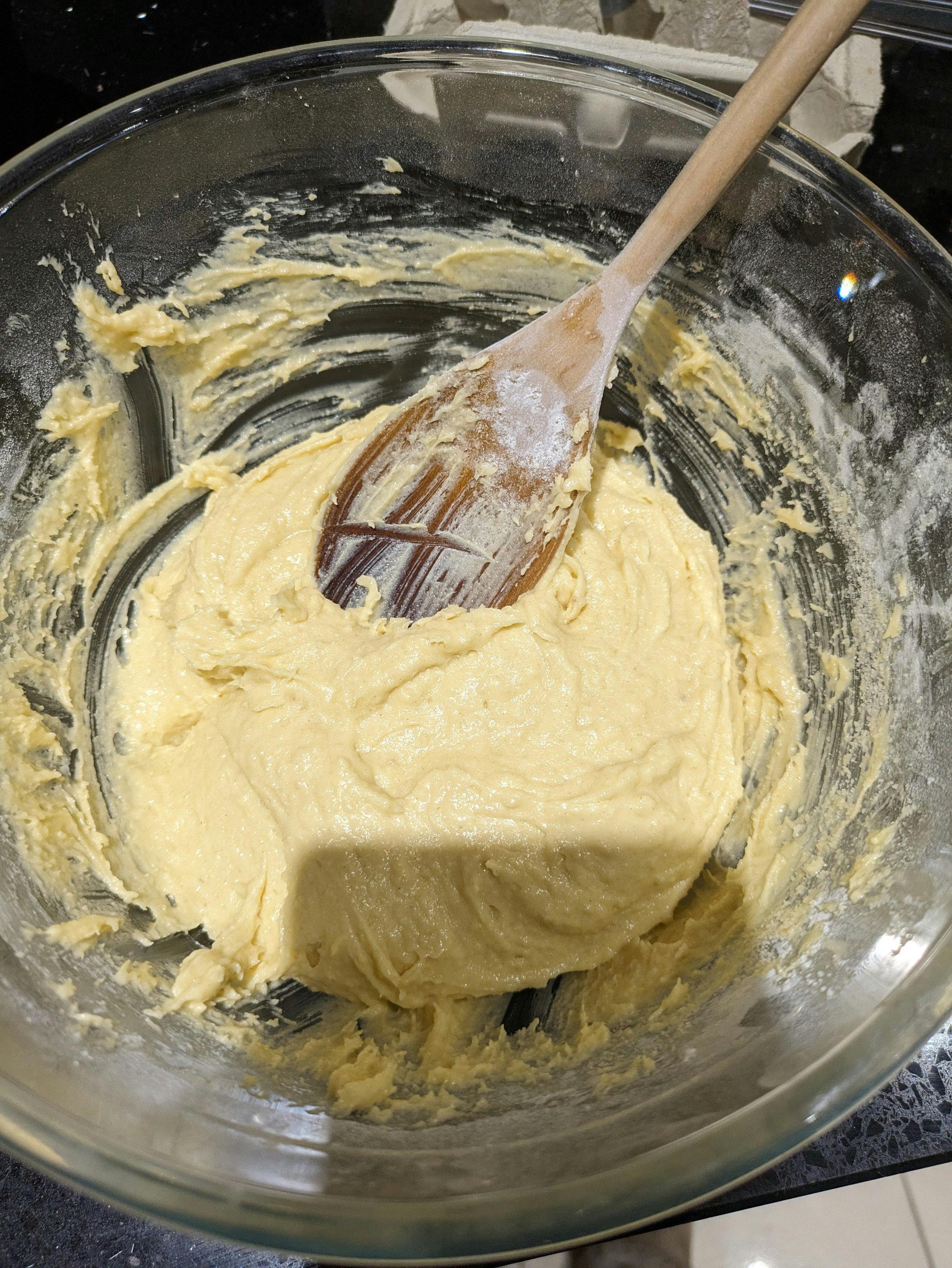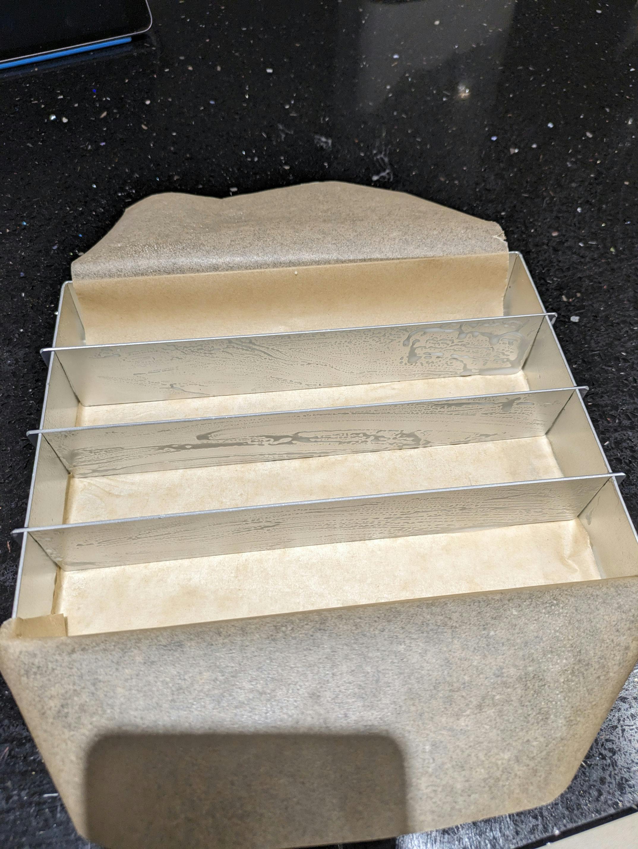 Spoon the mixture into the tin so that 2 of the sections have the pink mixture and the other 2 have the non-coloured mixture, and level
