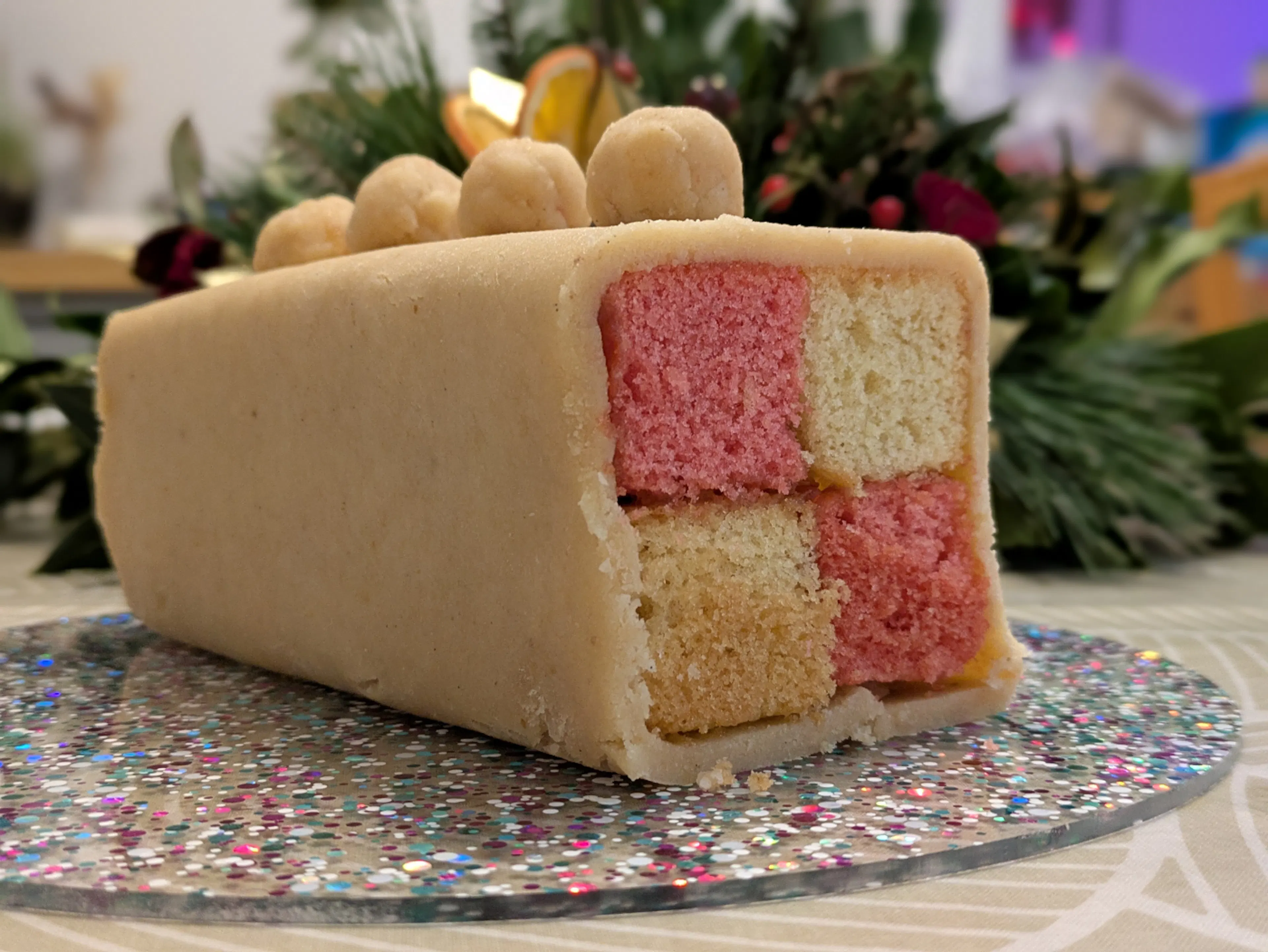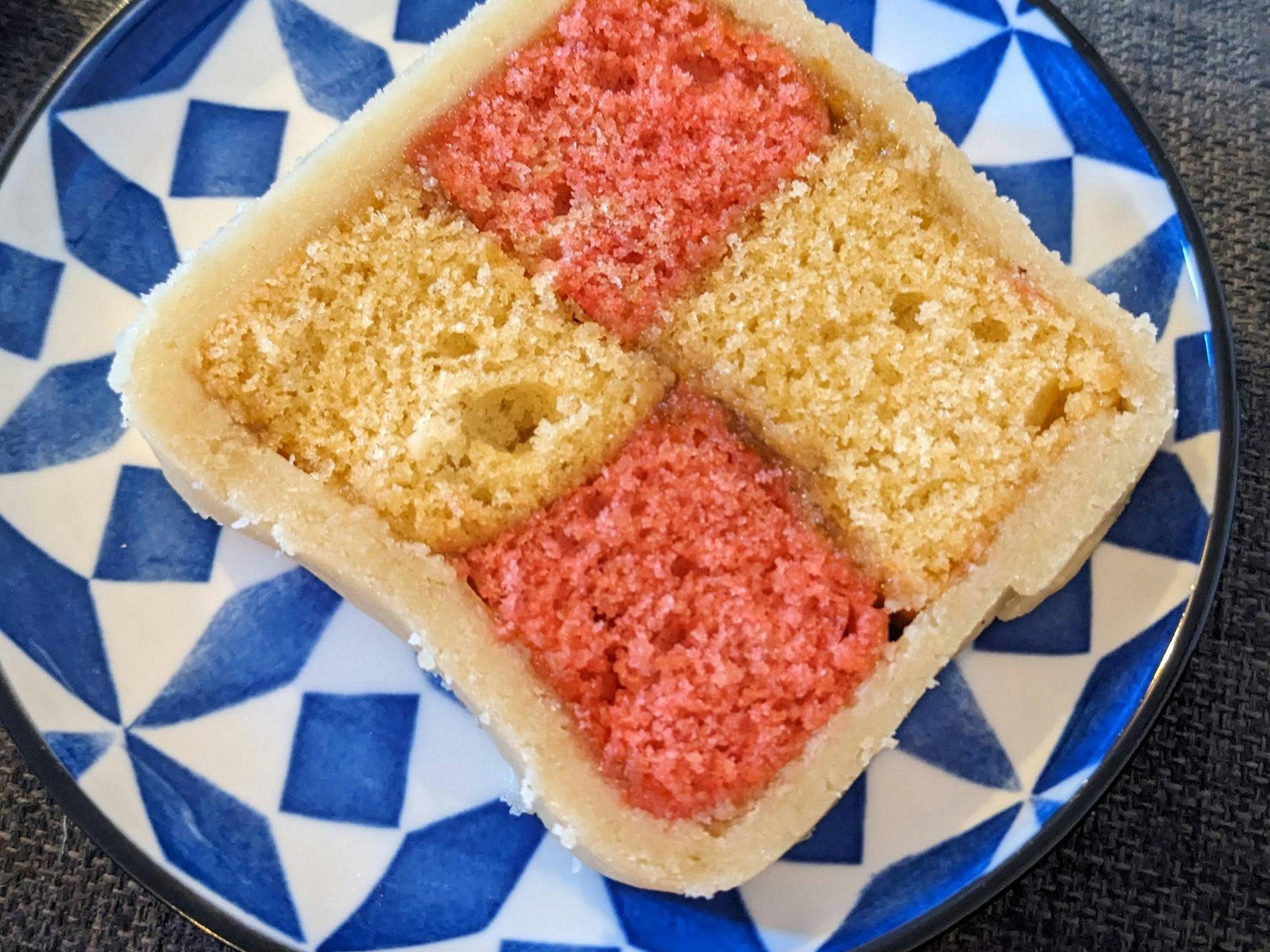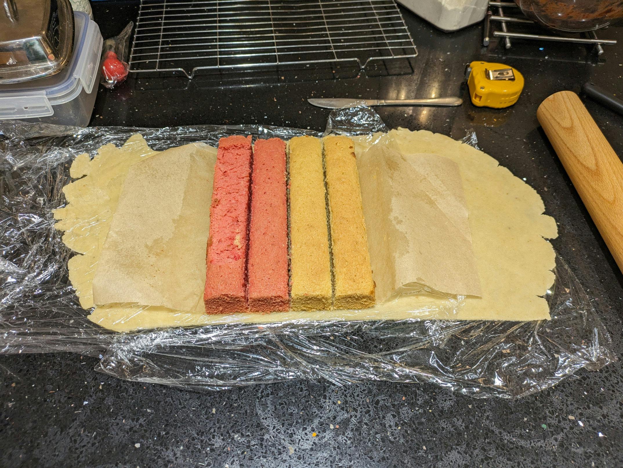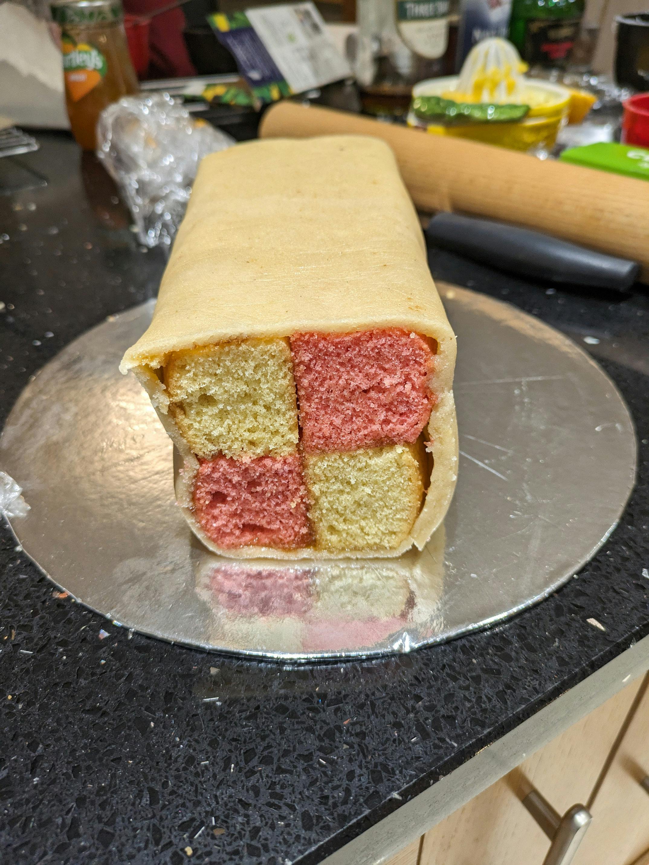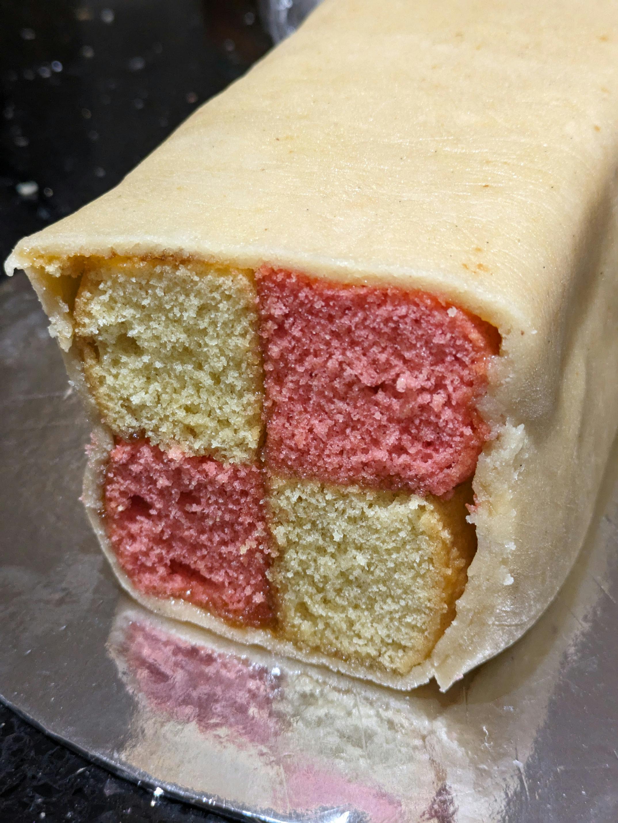 Trim off excess marzipan and the ends of the Battenberg to neaten