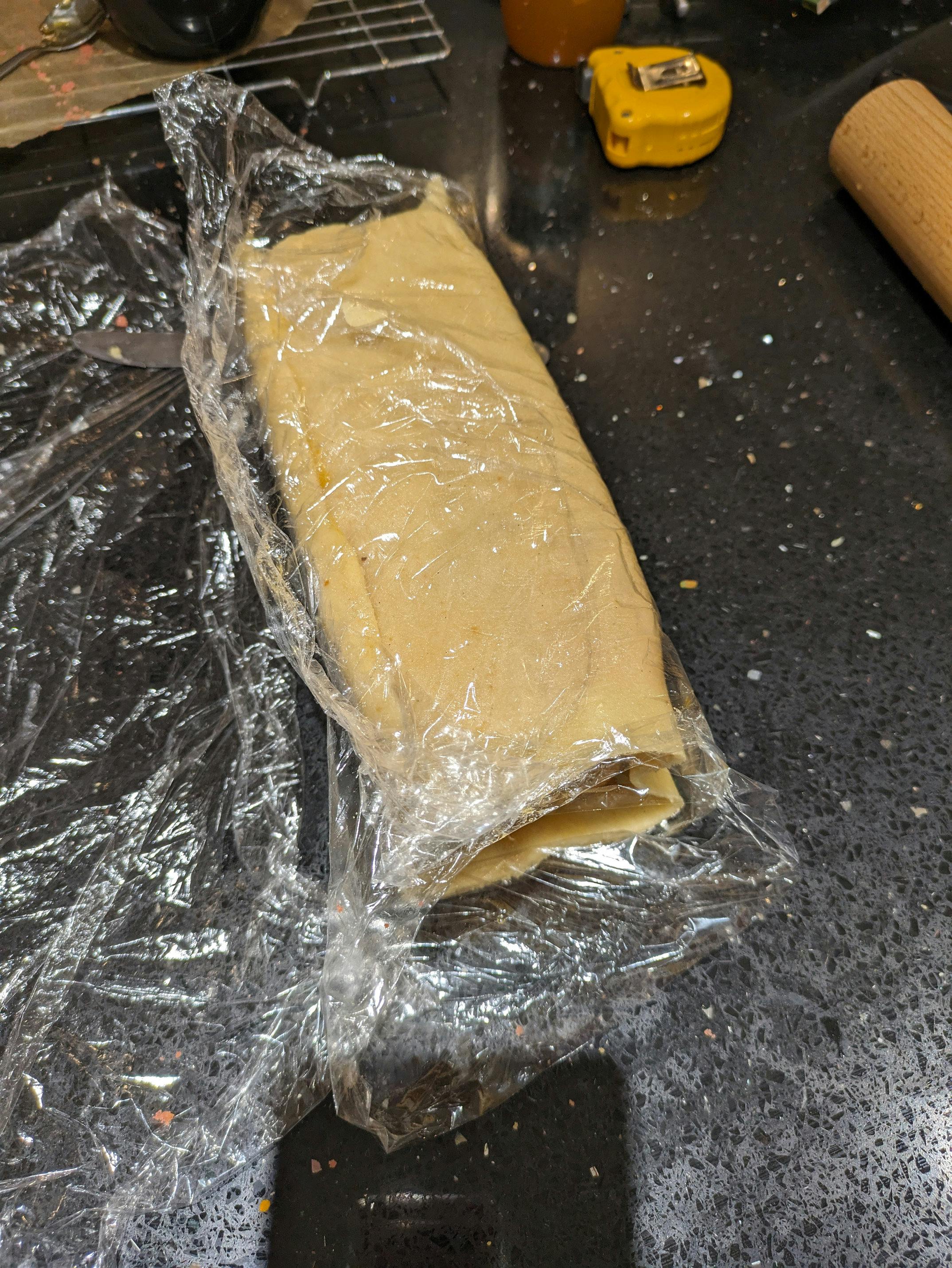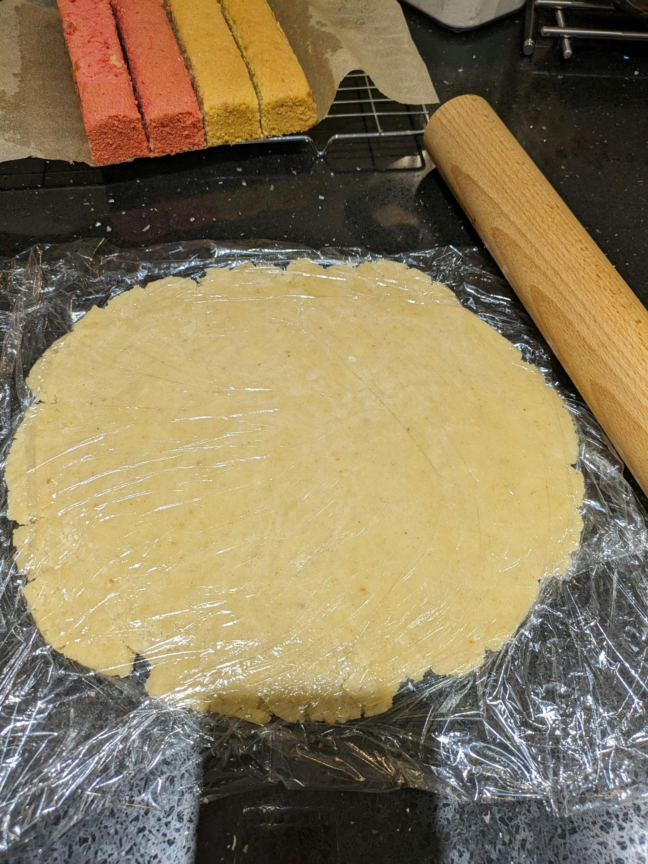 Roll out the marzipan big enough to wrap around the cake (tip: use two sheets of cling film, one above and one below, to stop sticking, then remove the top sheet before the next step)