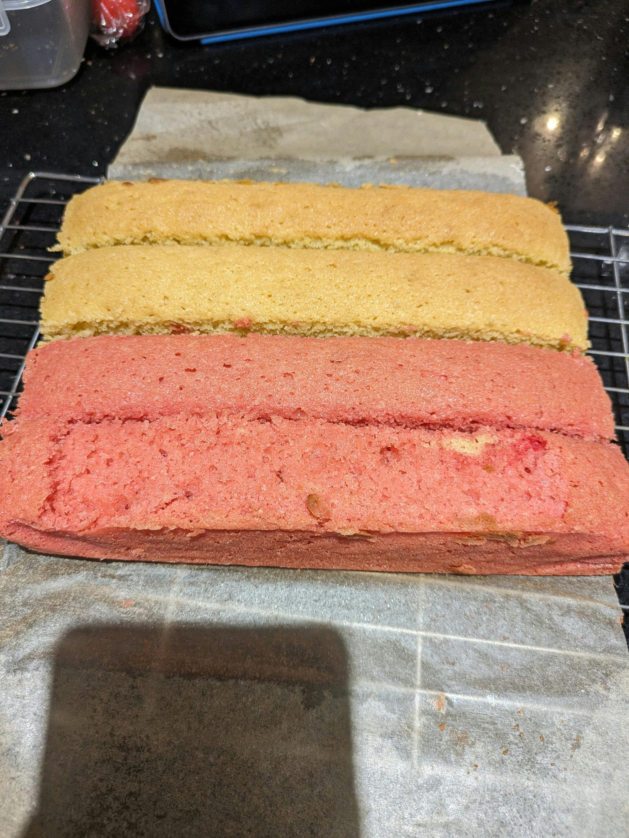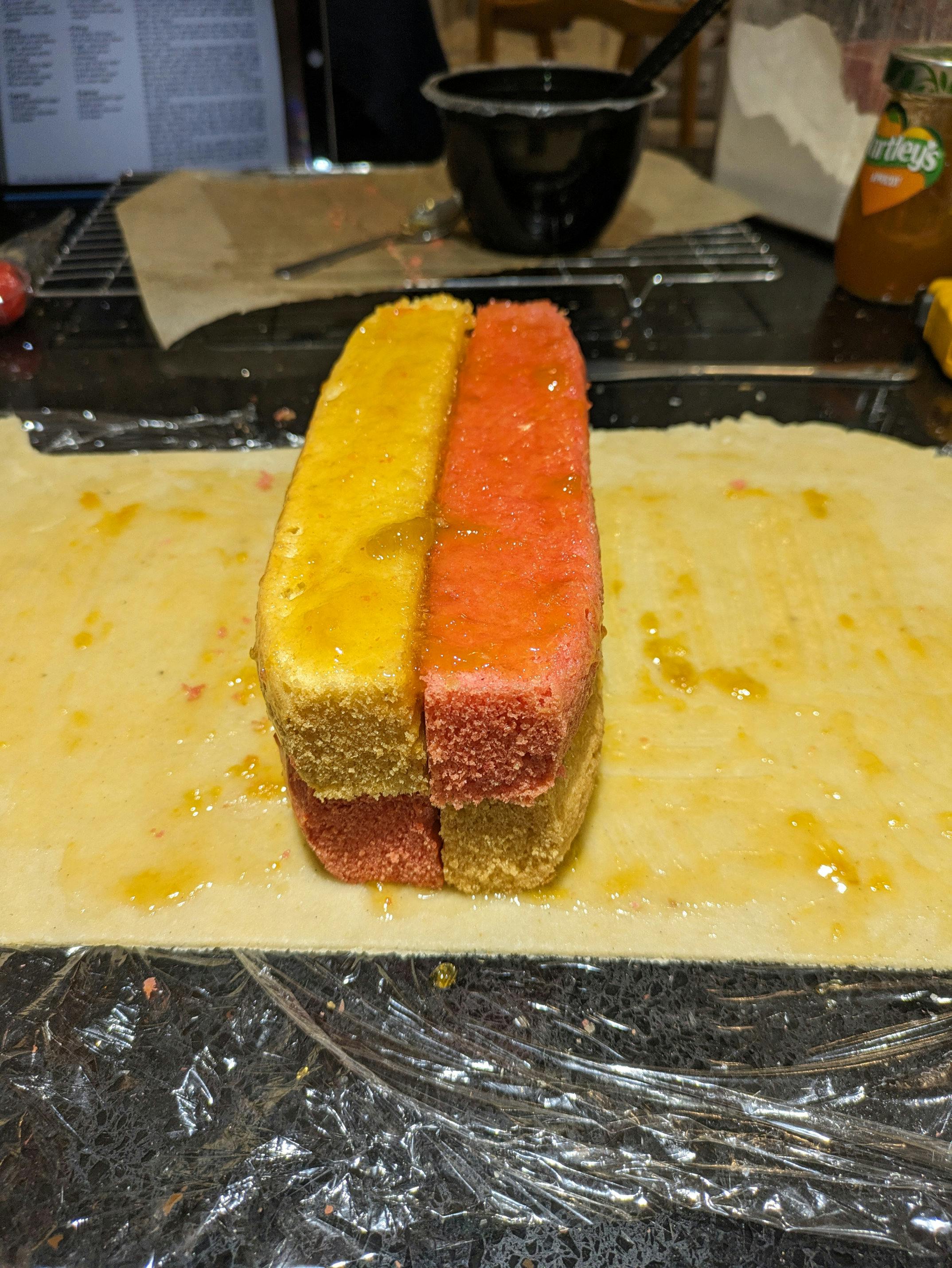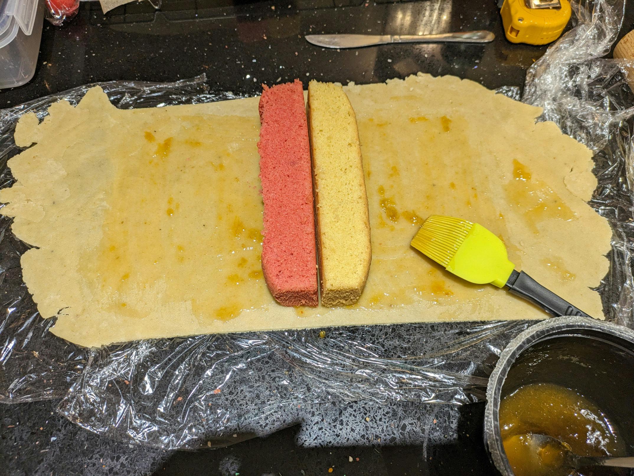 Brush apricot jam between a pink and non-coloured cake section and place in the middle of the marzipan