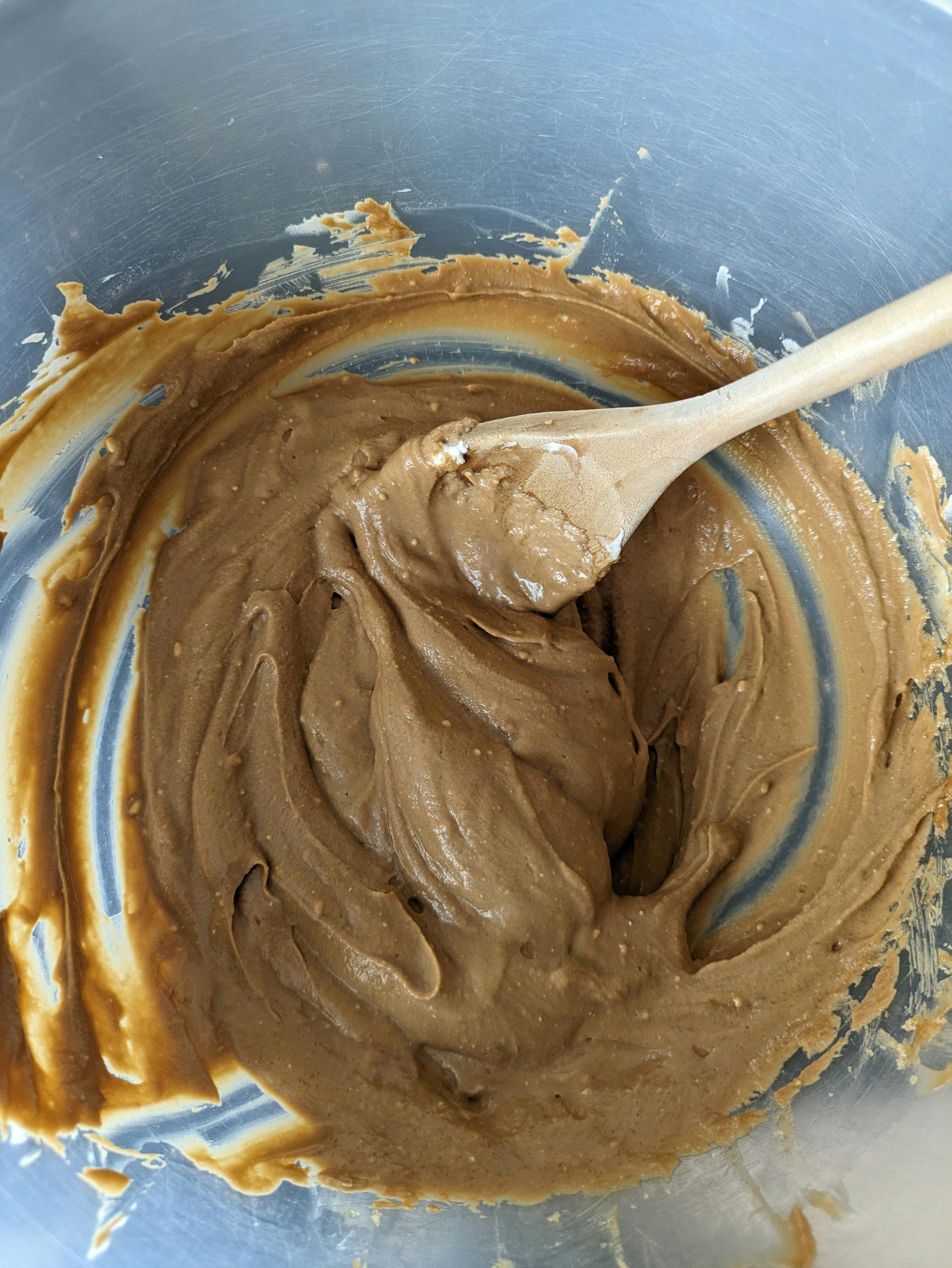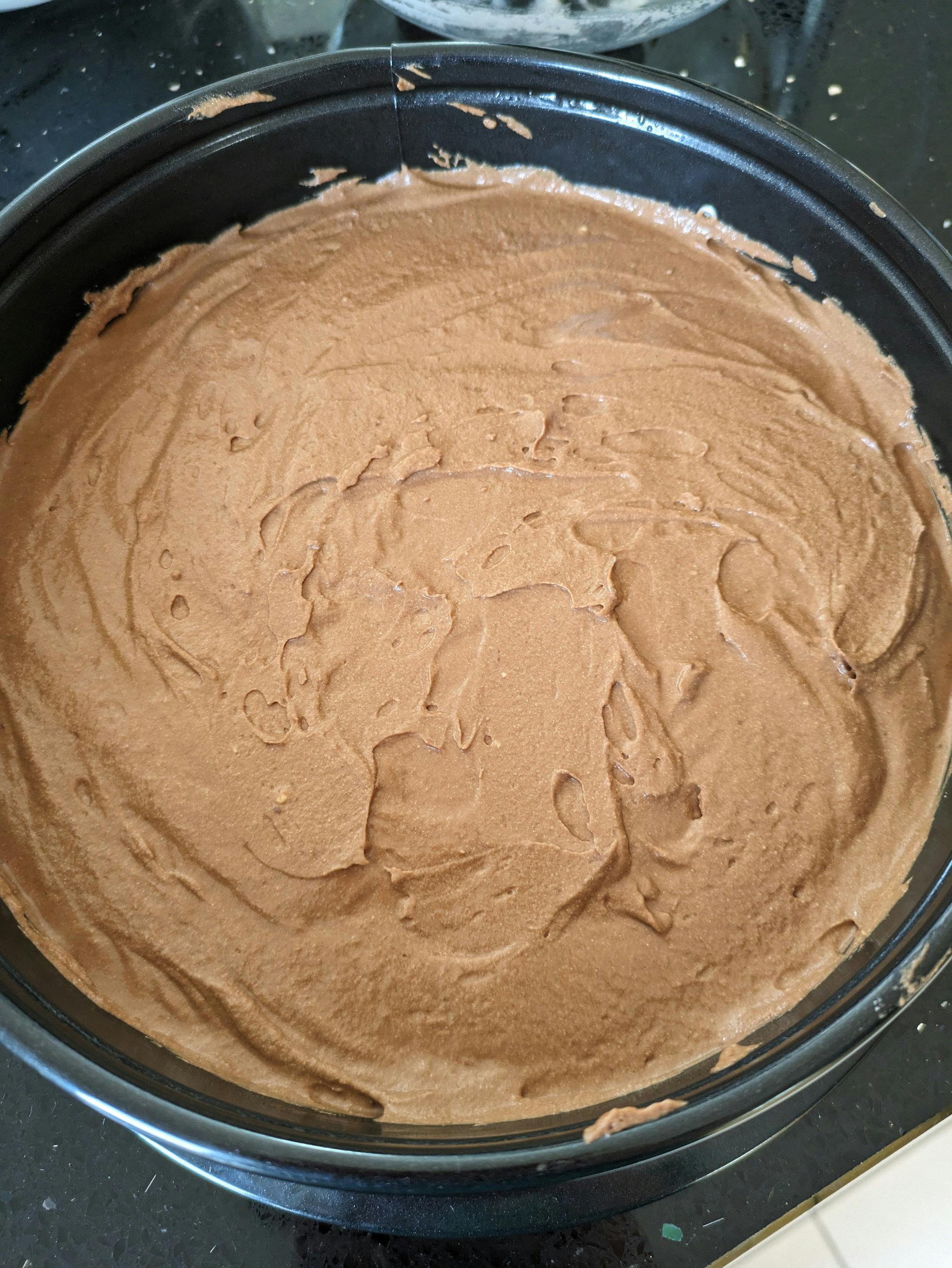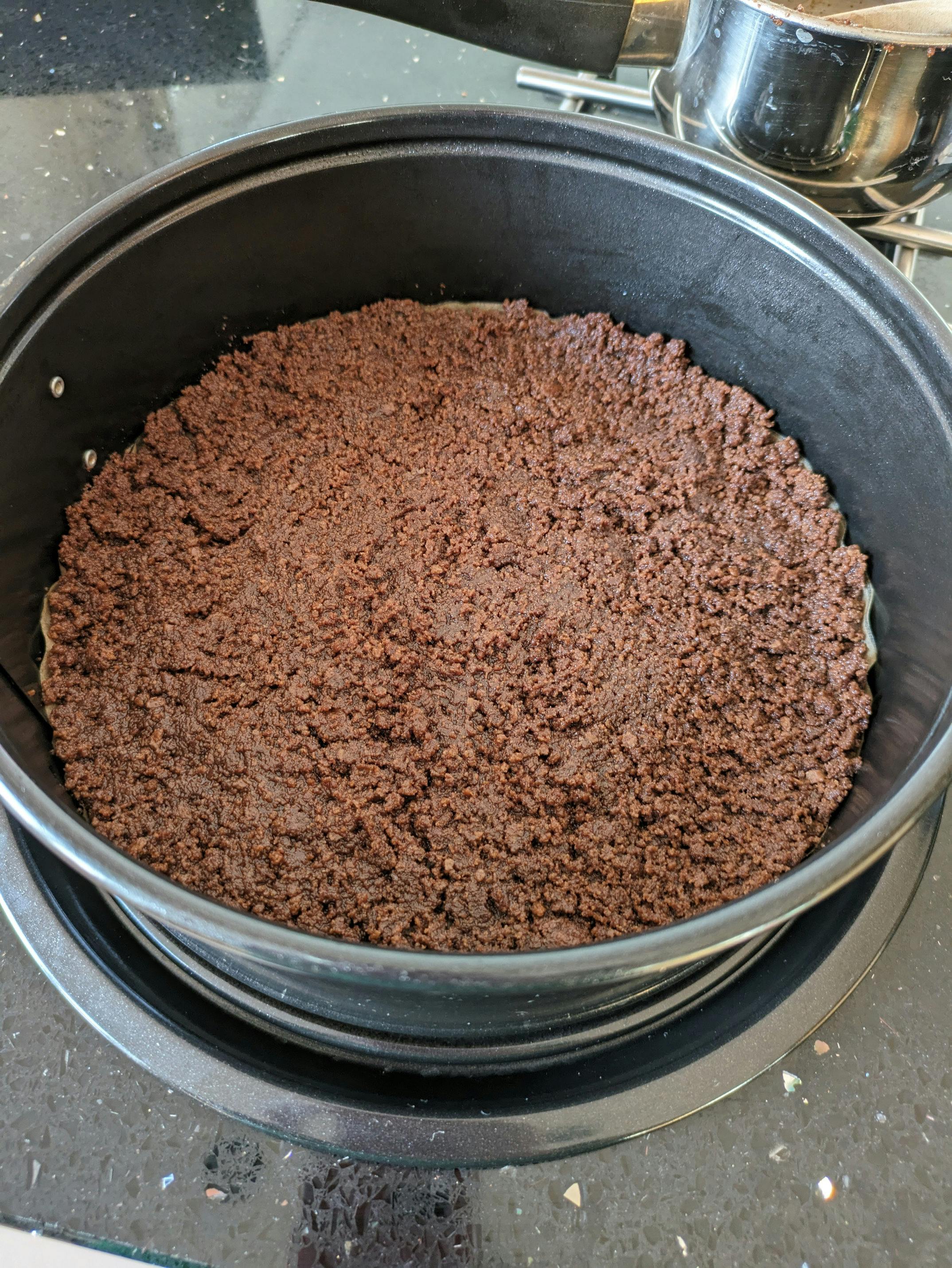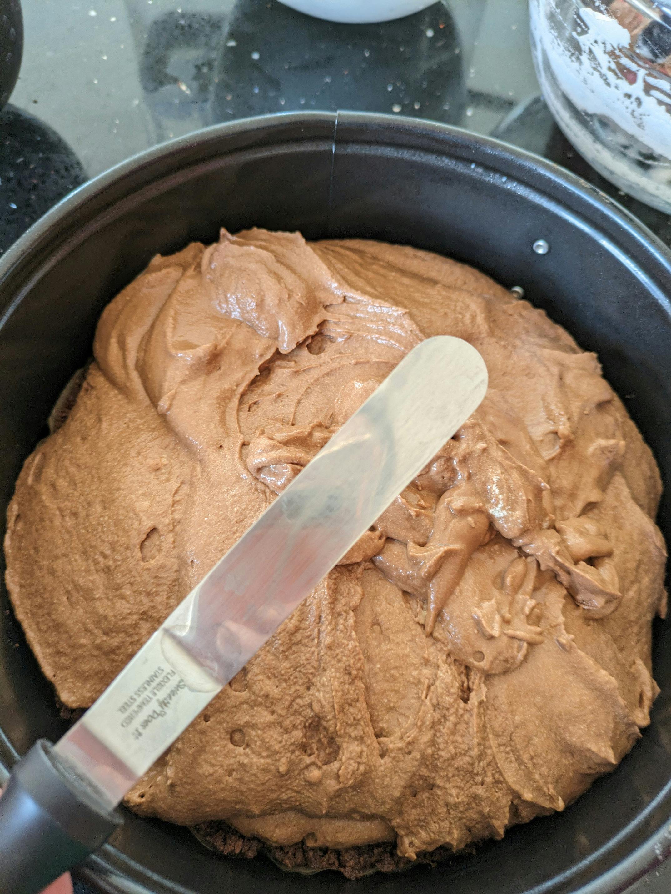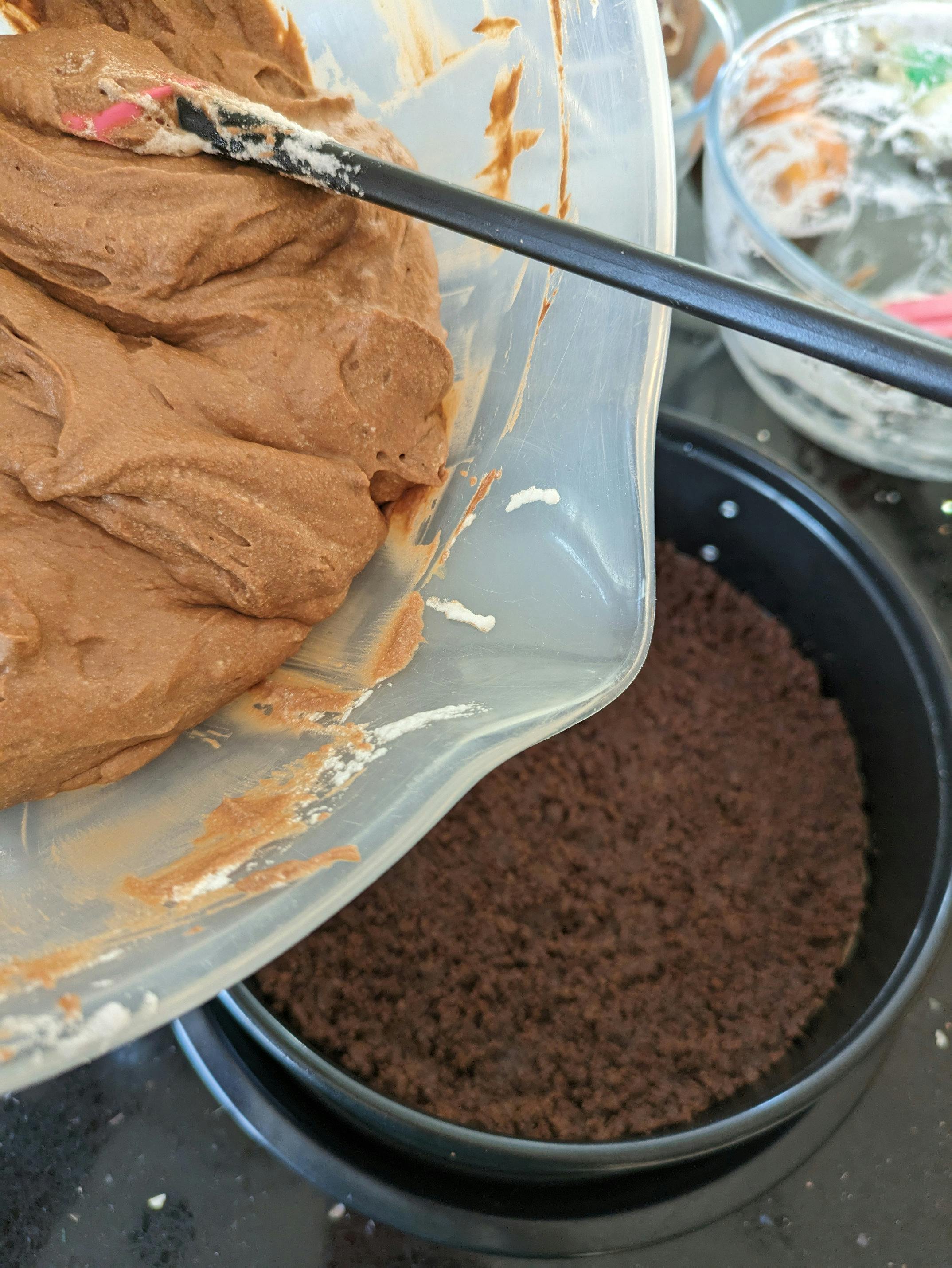 Add the combined mixture to the base that has been chilling and smooth out flat