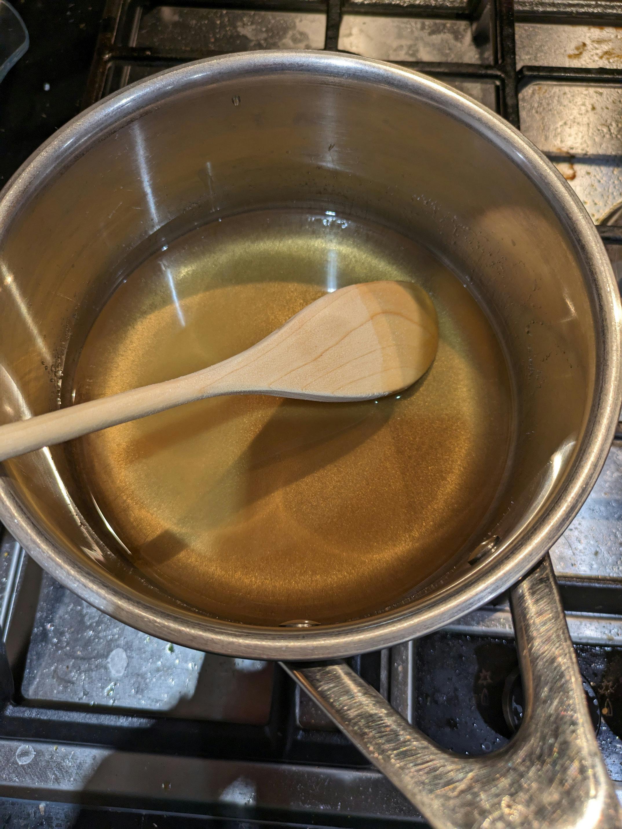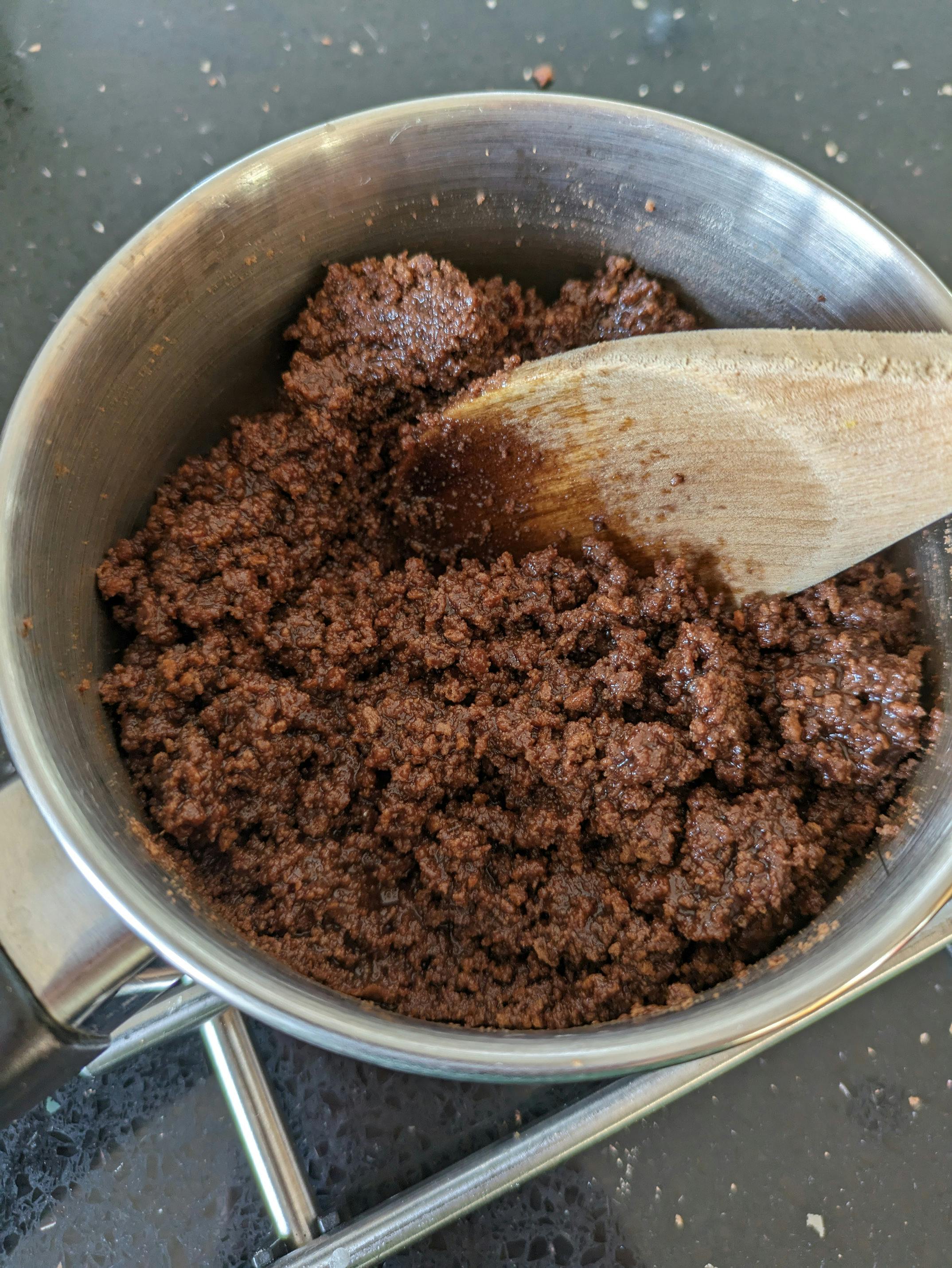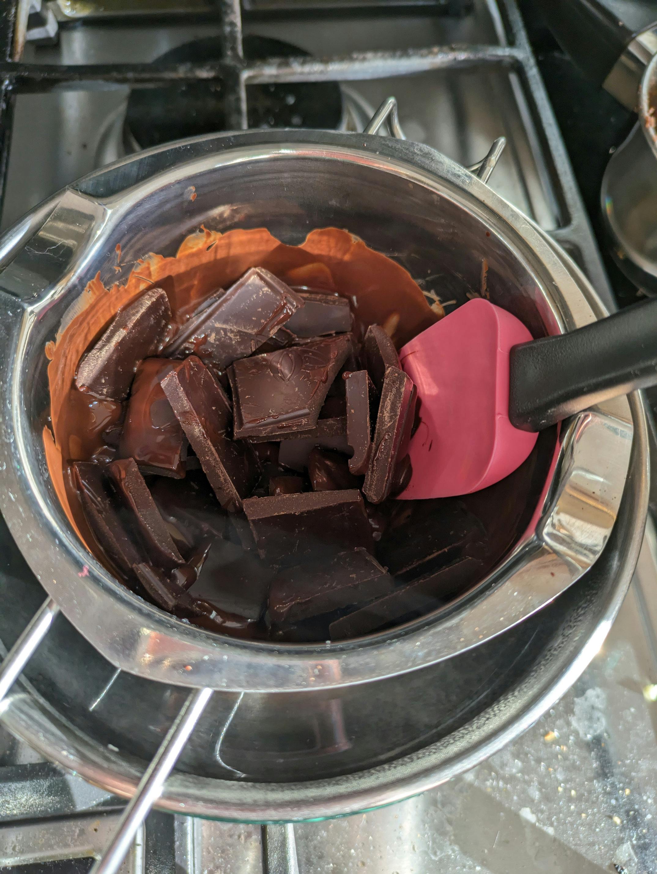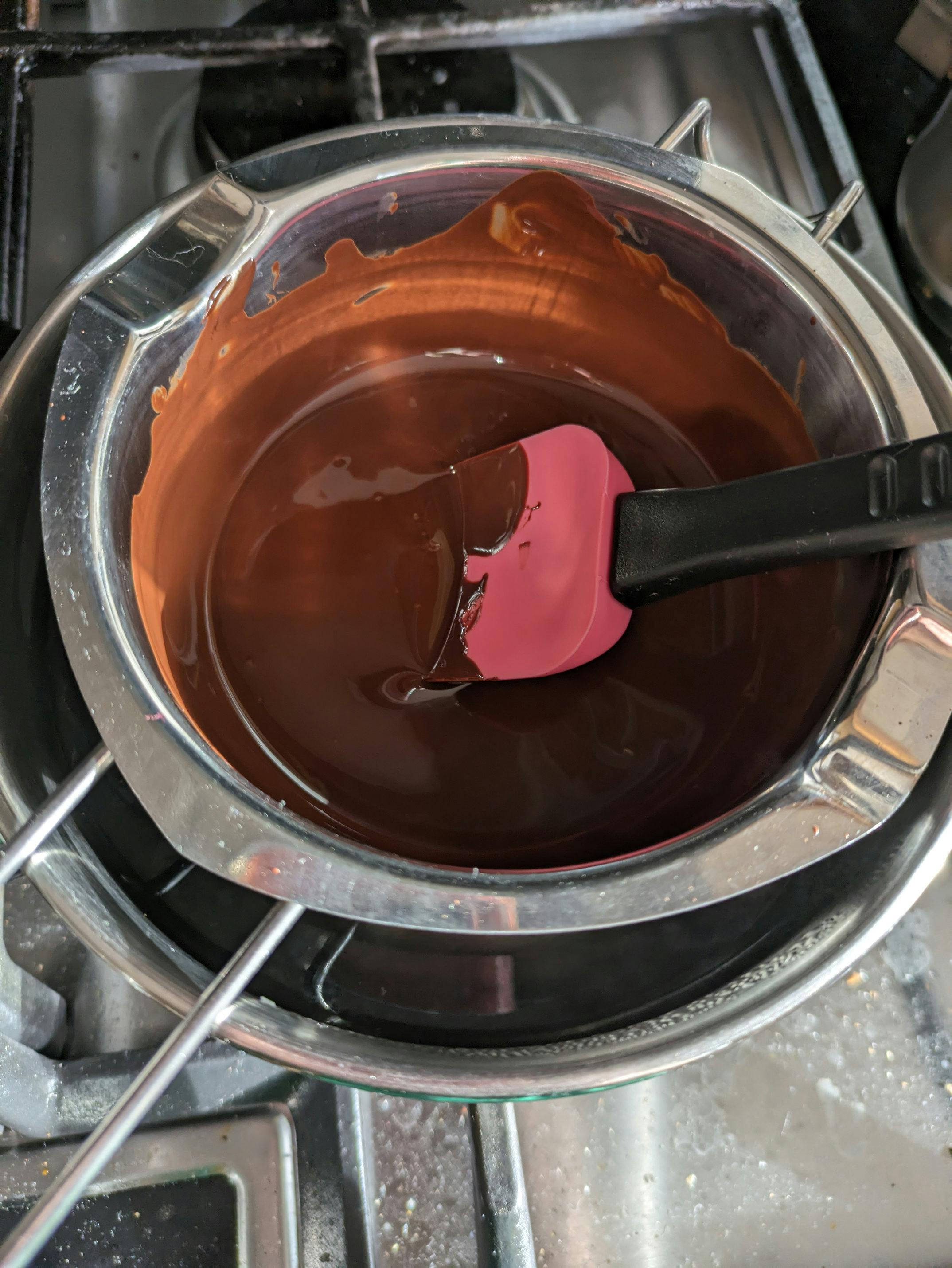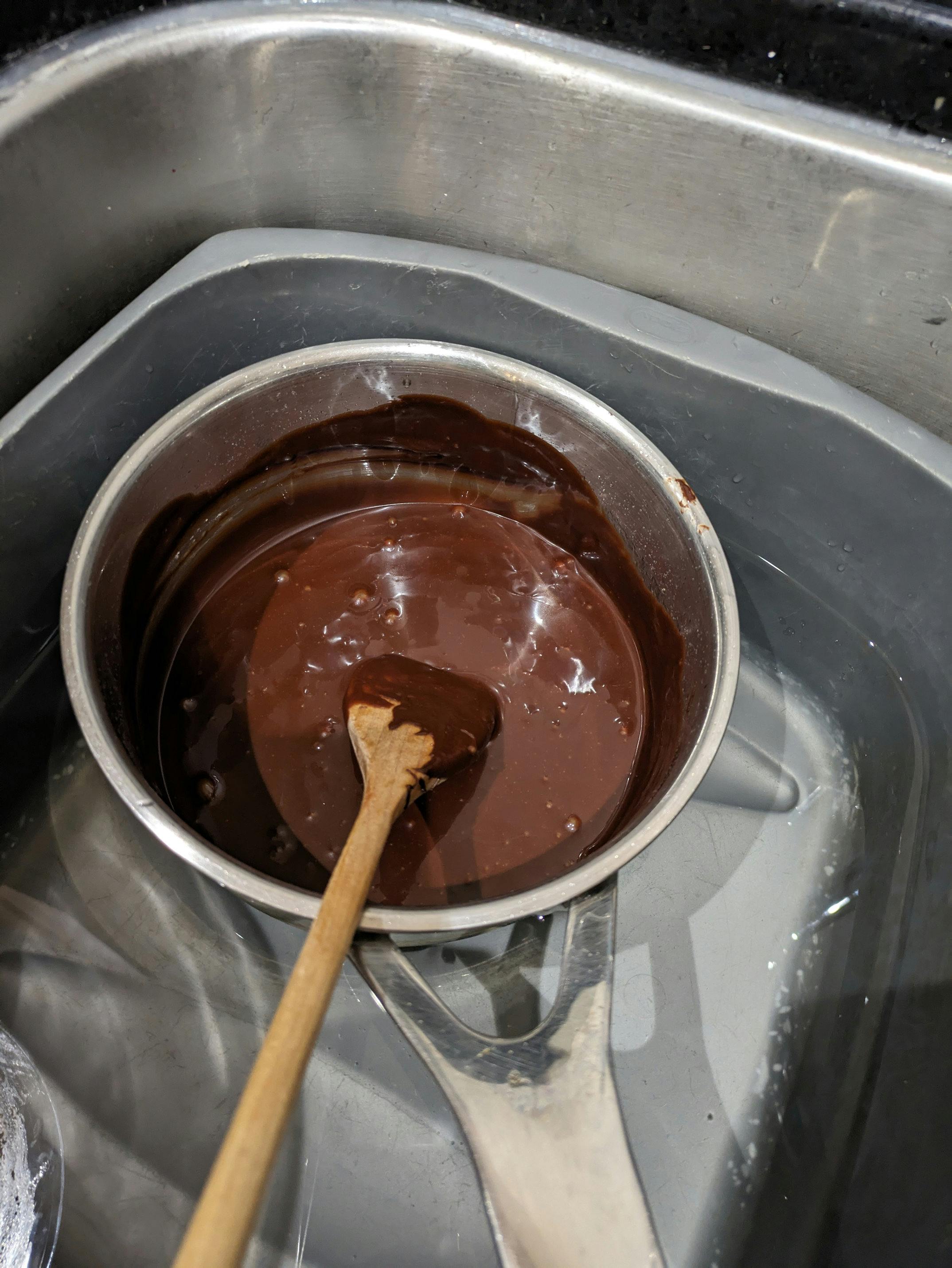 Once the sugar has dissolved, leave to cool down until the temperature drops to under 50 degC, then add in the melted chocolate and continually stir until mixed.