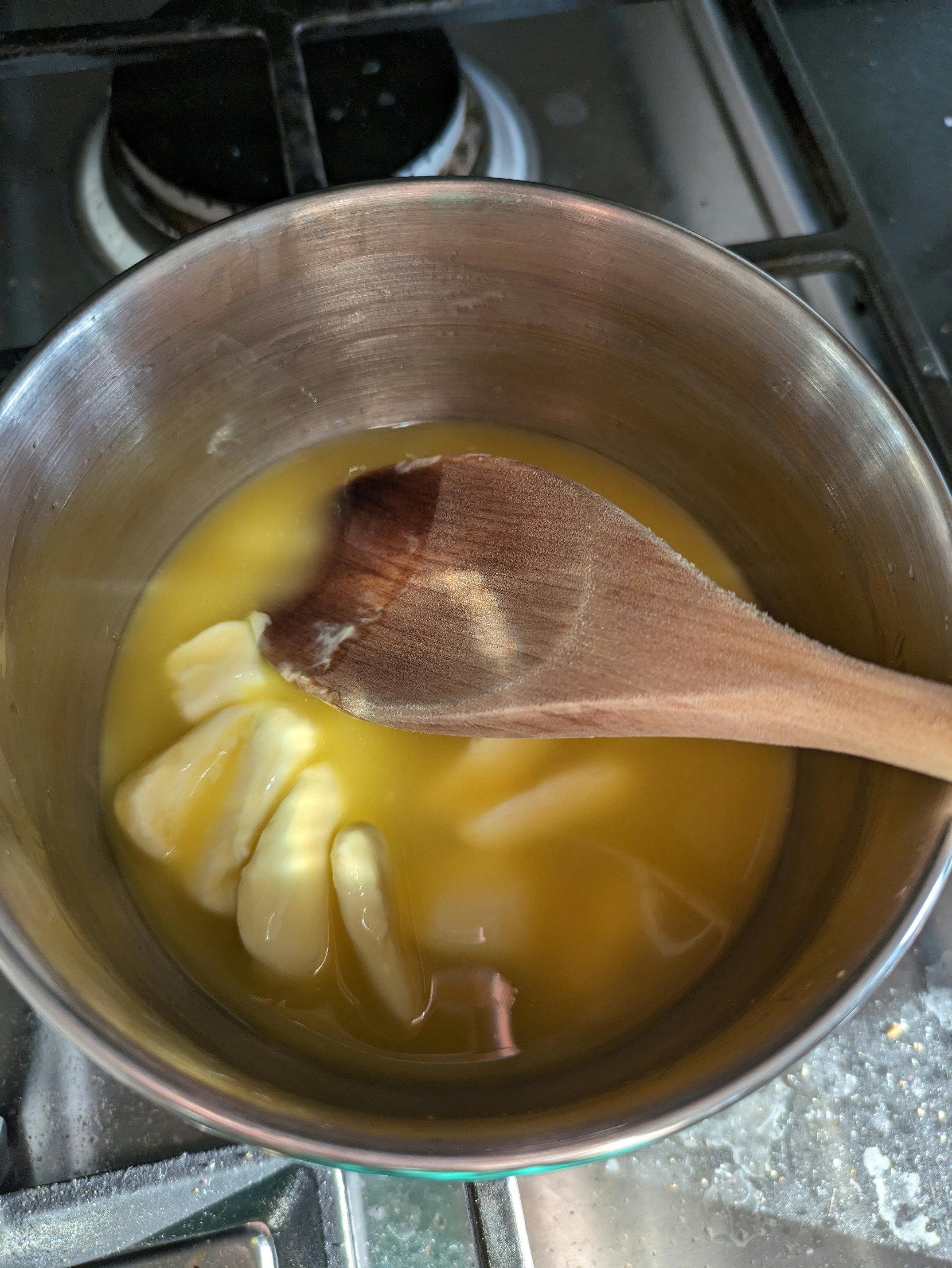 Melt the butter/margarine and sugar in a saucepan over a gentle heat. Once melted take of the heat.