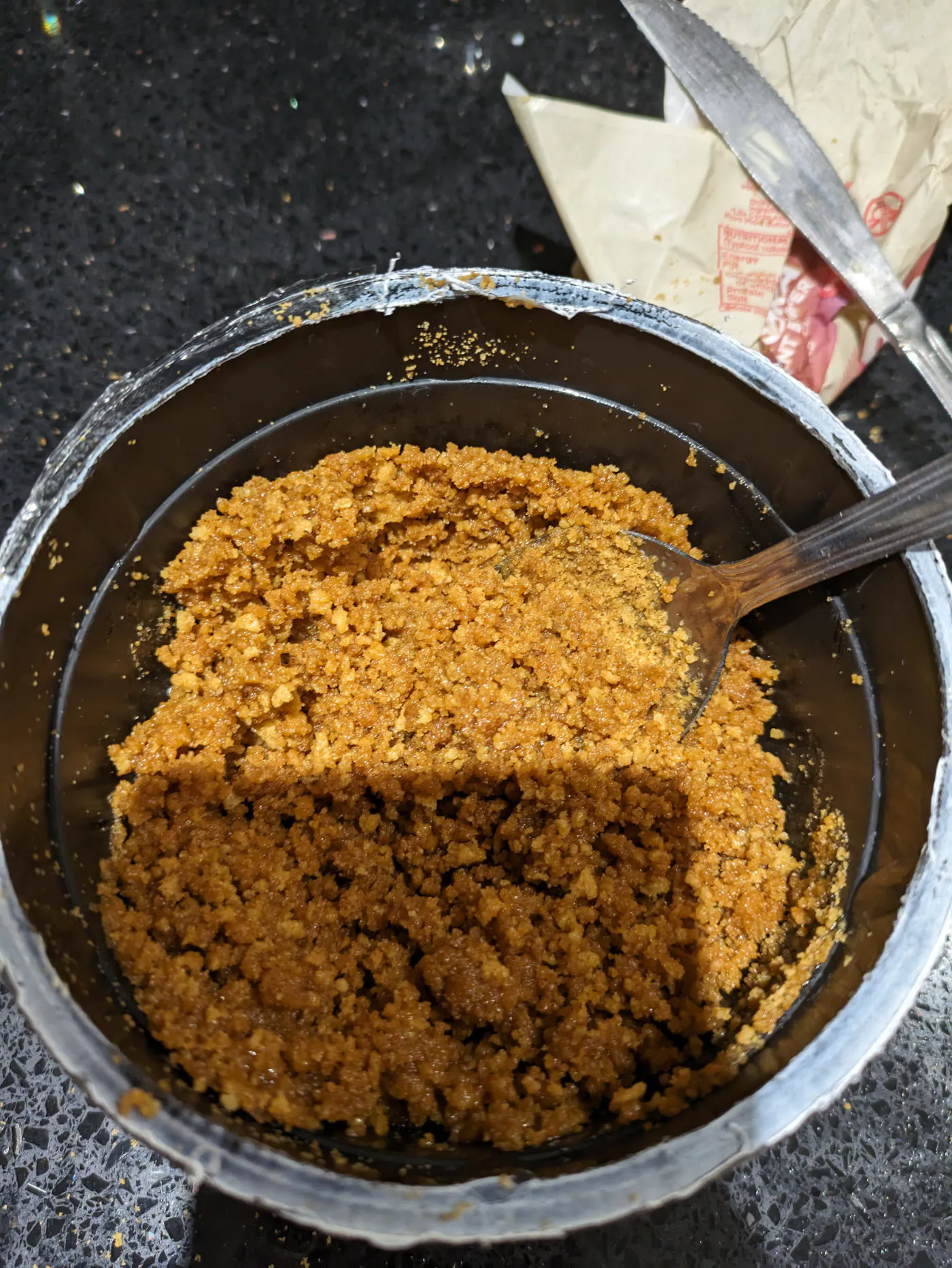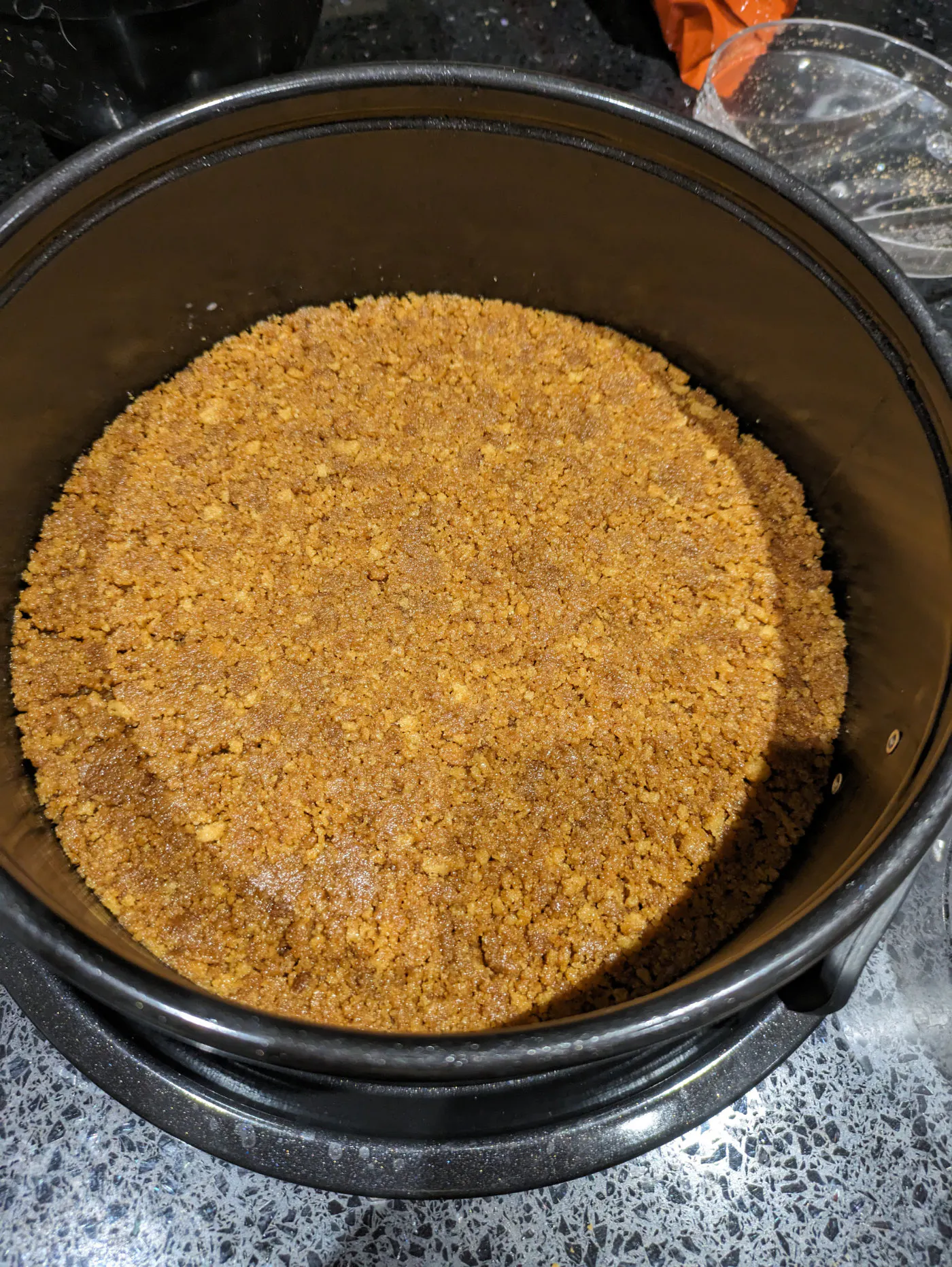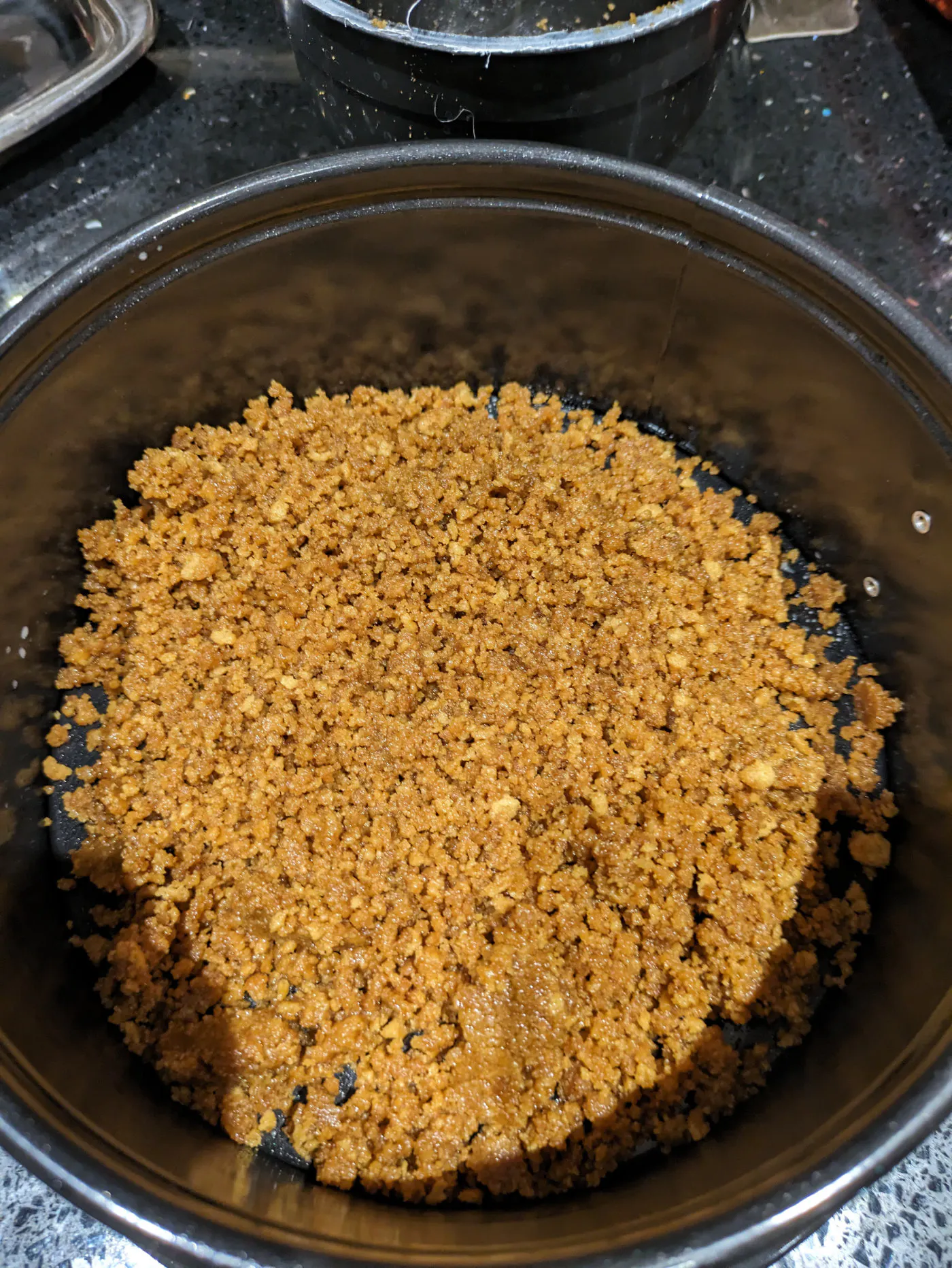 Spoon the biscuit crumb base into the tin and level