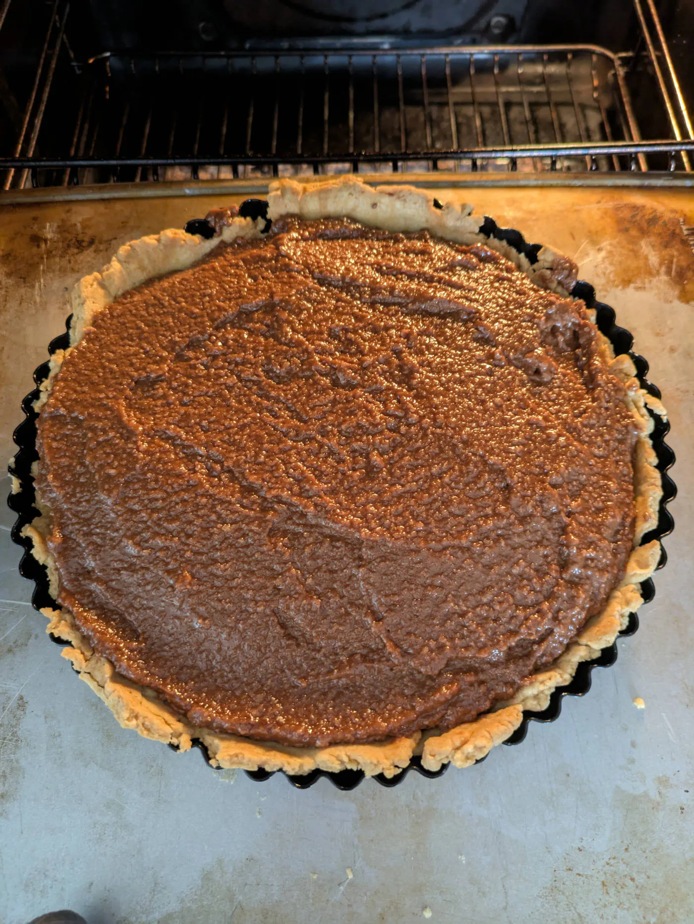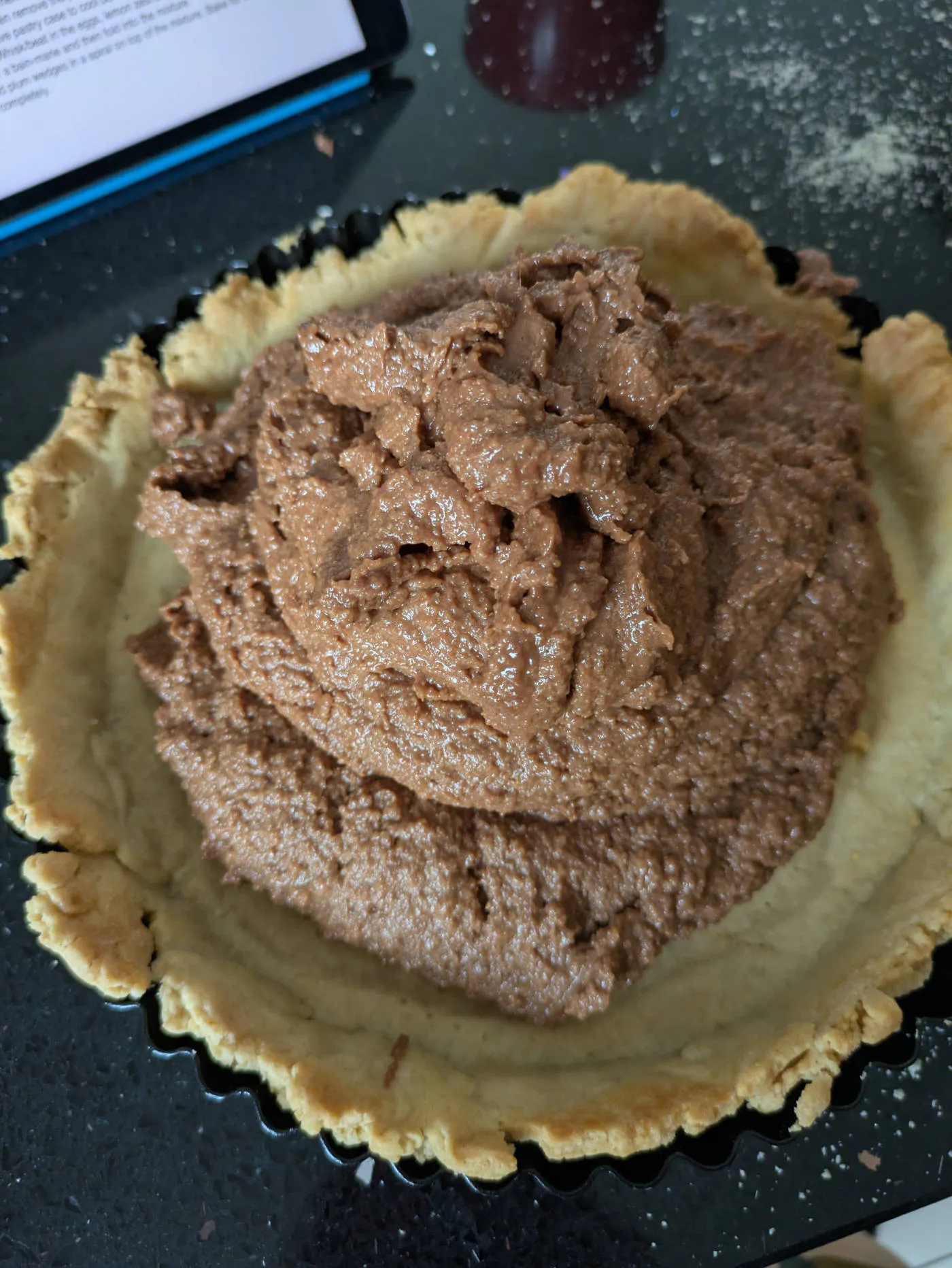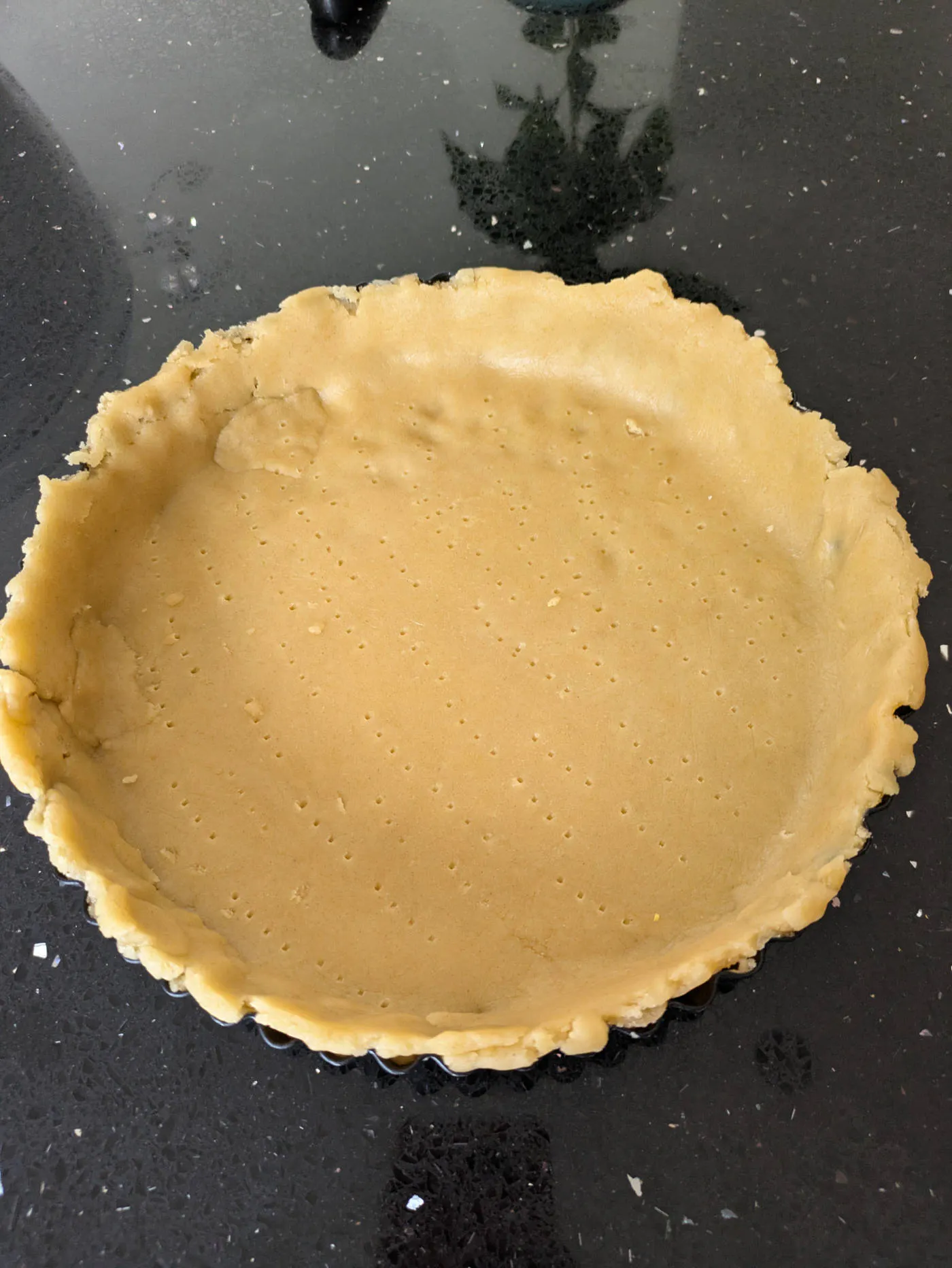 Roll out the pastry large enough to cover the flan dish (tip roll between two sheets of cling film, this helps with preventing the pastry from sticking, and you can also use the cling to manoeuvre the pastry over the flan dish). Refrigerate the pastry case for 30 minutes.