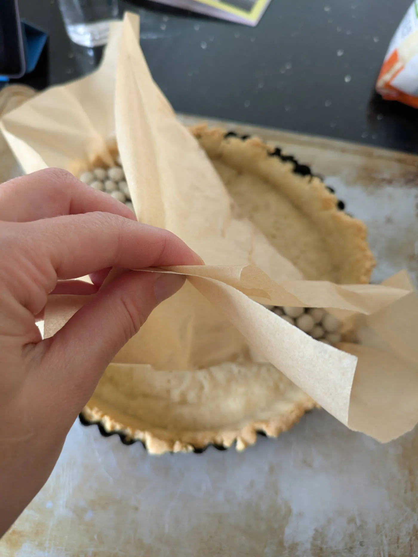 Prick the pastry case with a fork, then line with baking parchment and fill with baking beans (or alternatively rice or crumpled foil). Blind bake in the oven for 20 minutes. Then remove the parchment and baking beans, and cook for a further 5 minutes until golden and biscuity. Leave pastry case to cool before adding filling.