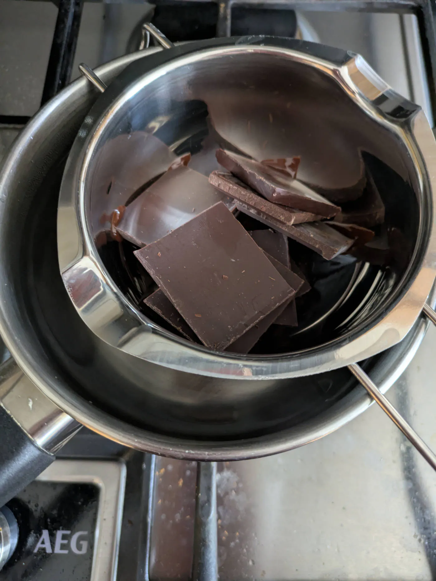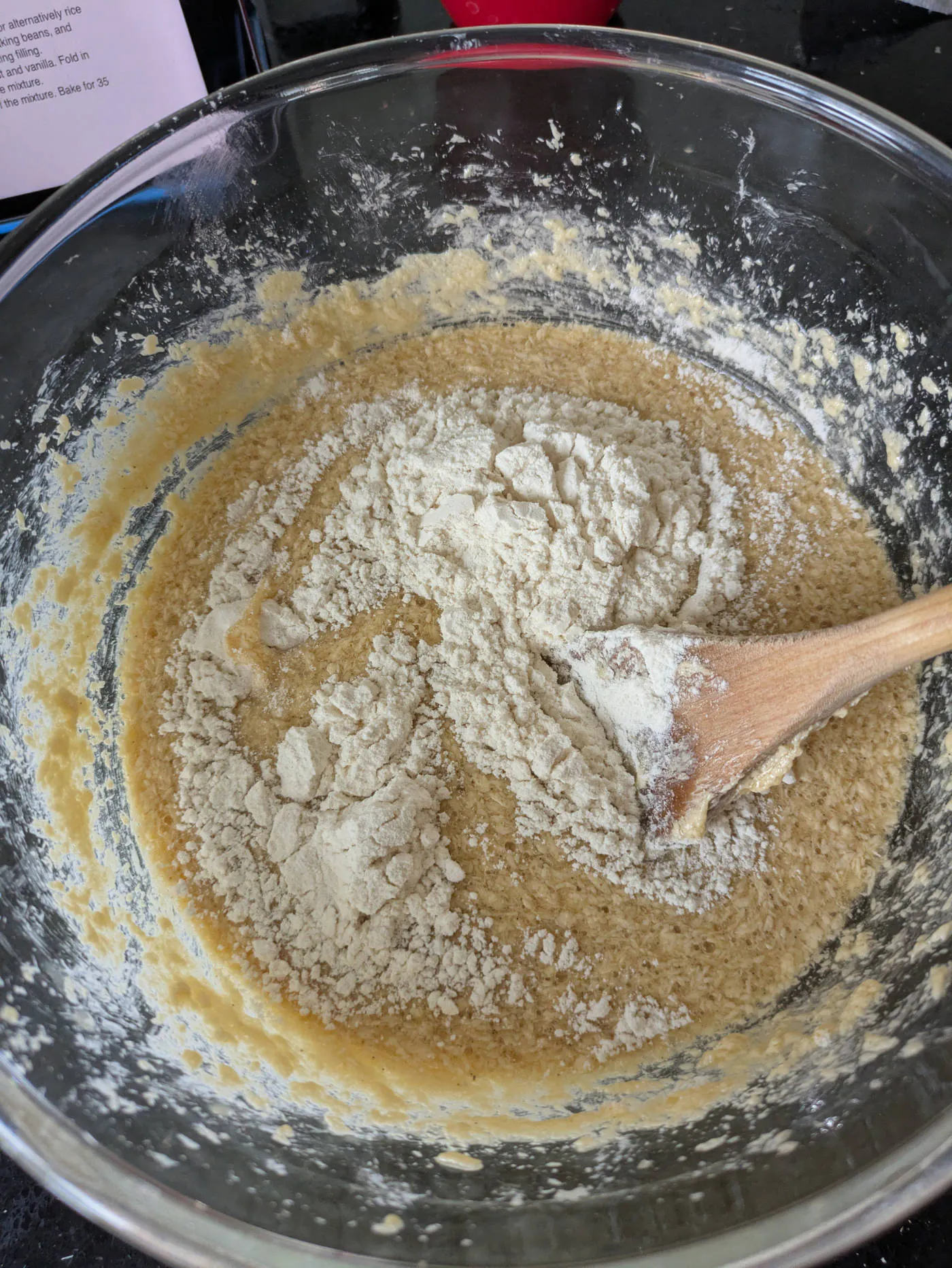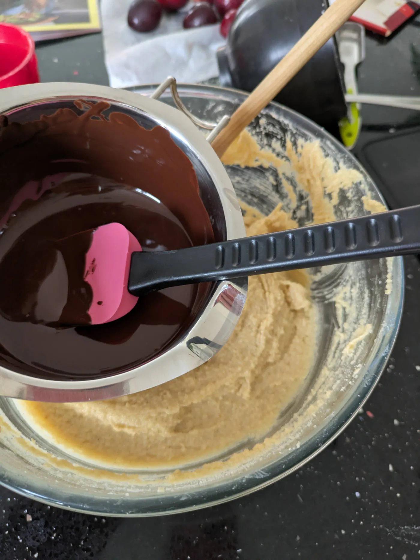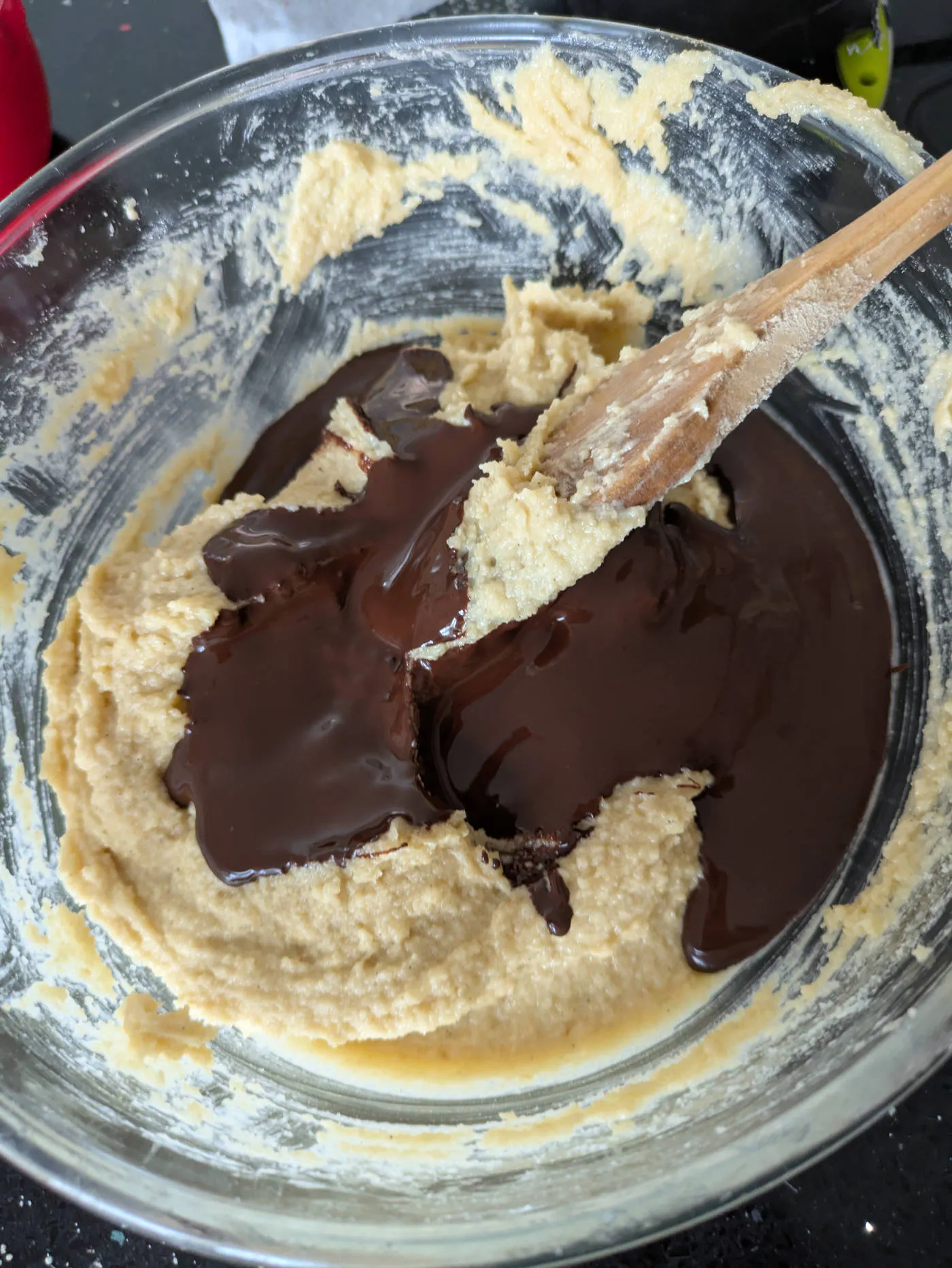 Beat together the butter and sugar until light and fluffy. Whisk/beat in the eggs, lemon zest and vanilla. Fold in the flour and ground almonds. Melt the chocolate over a bain-marie and then fold into the mixture.
