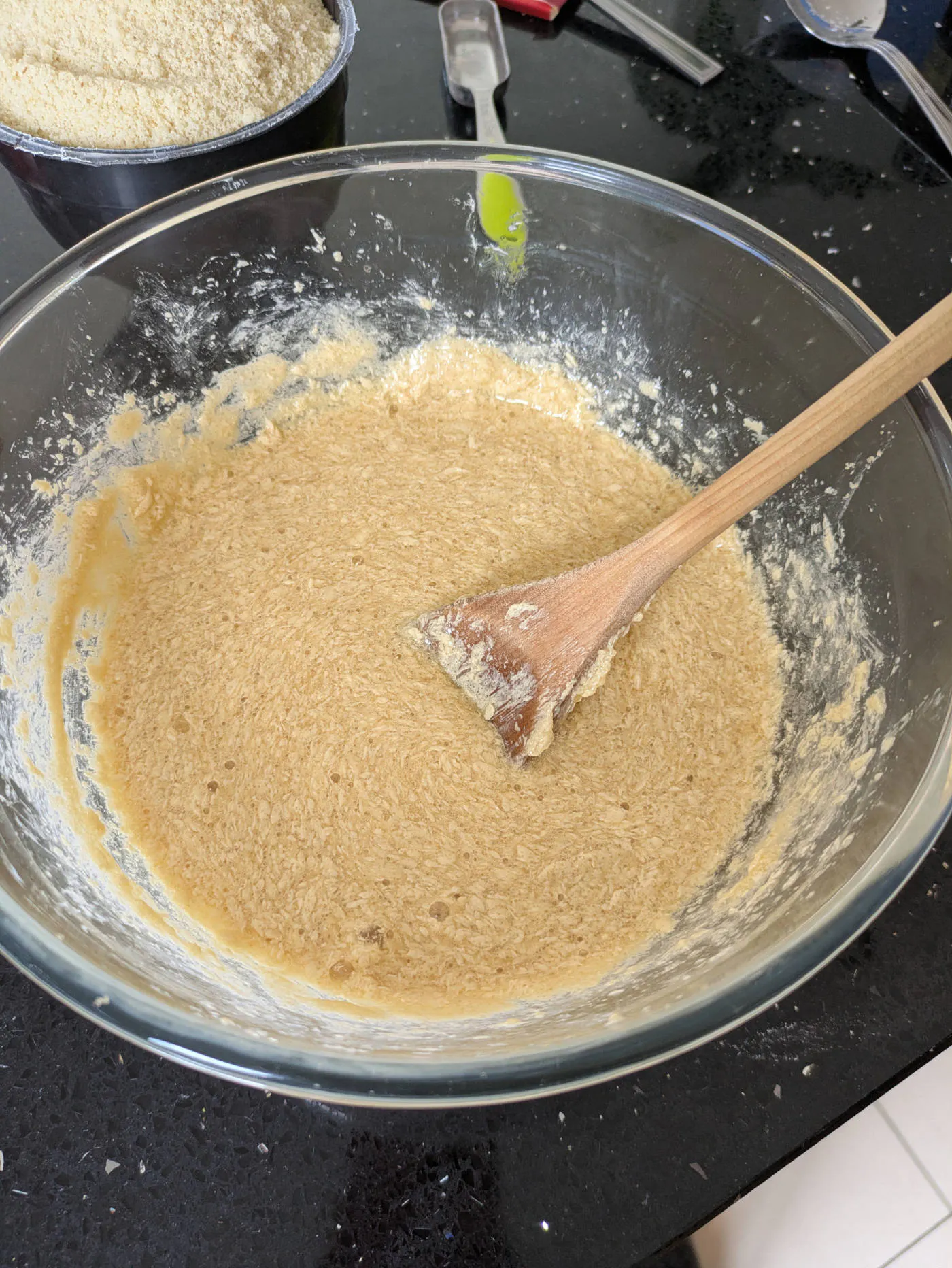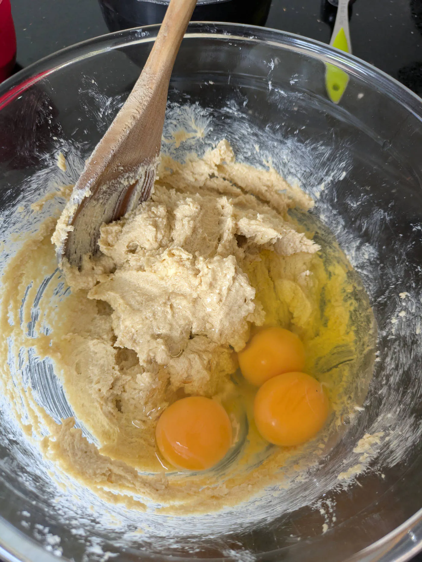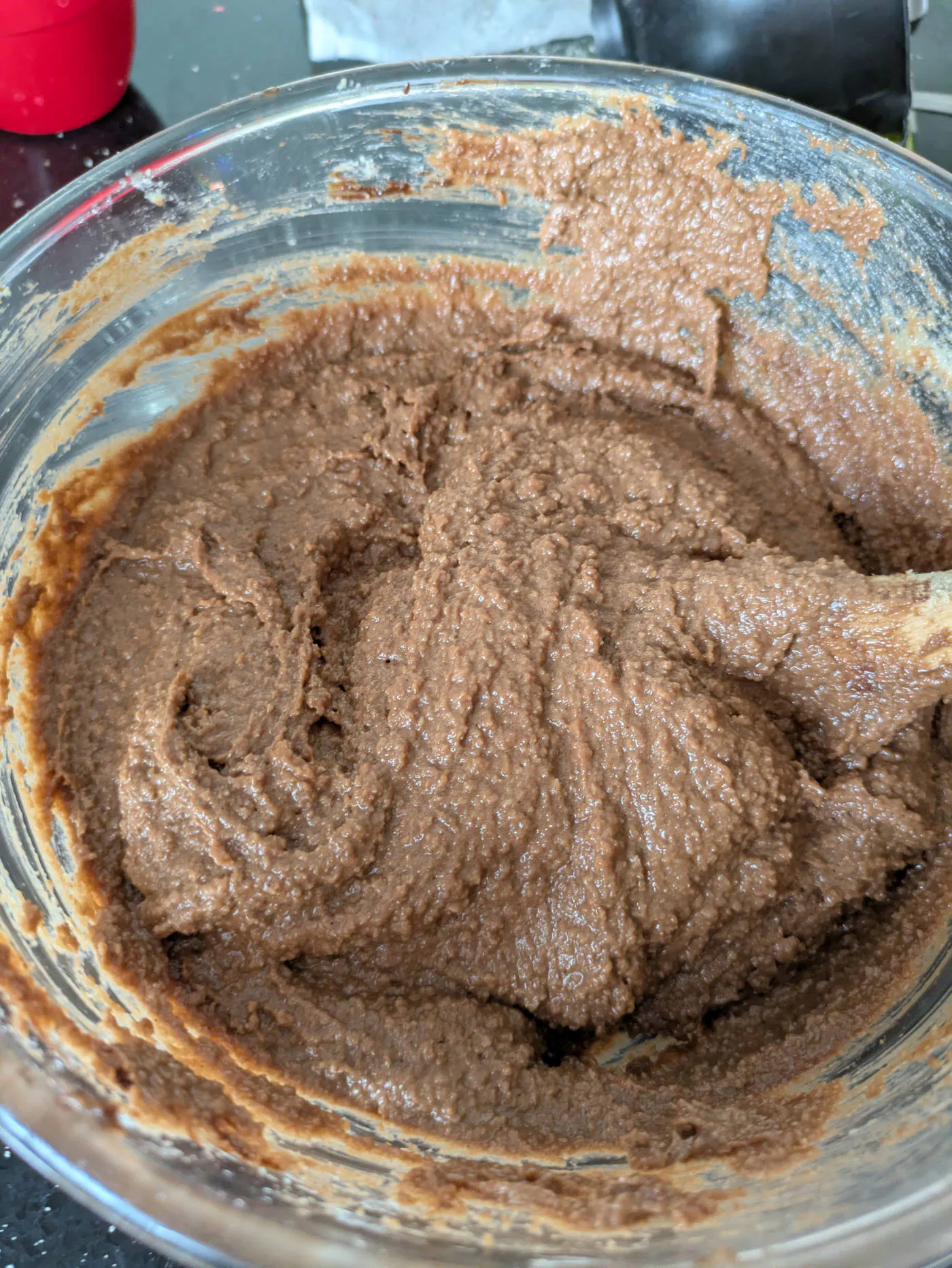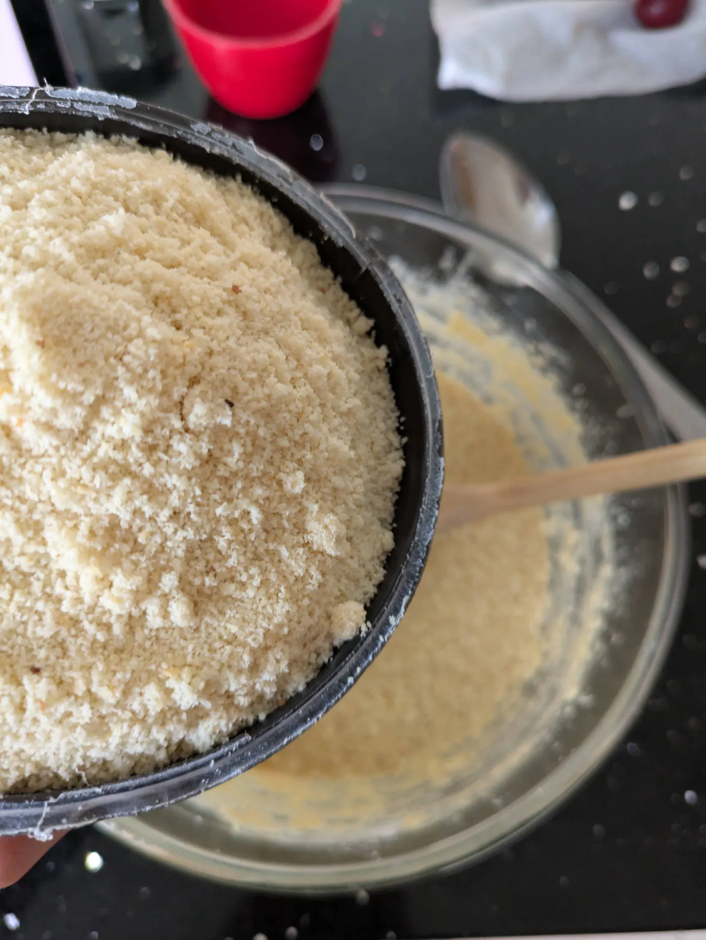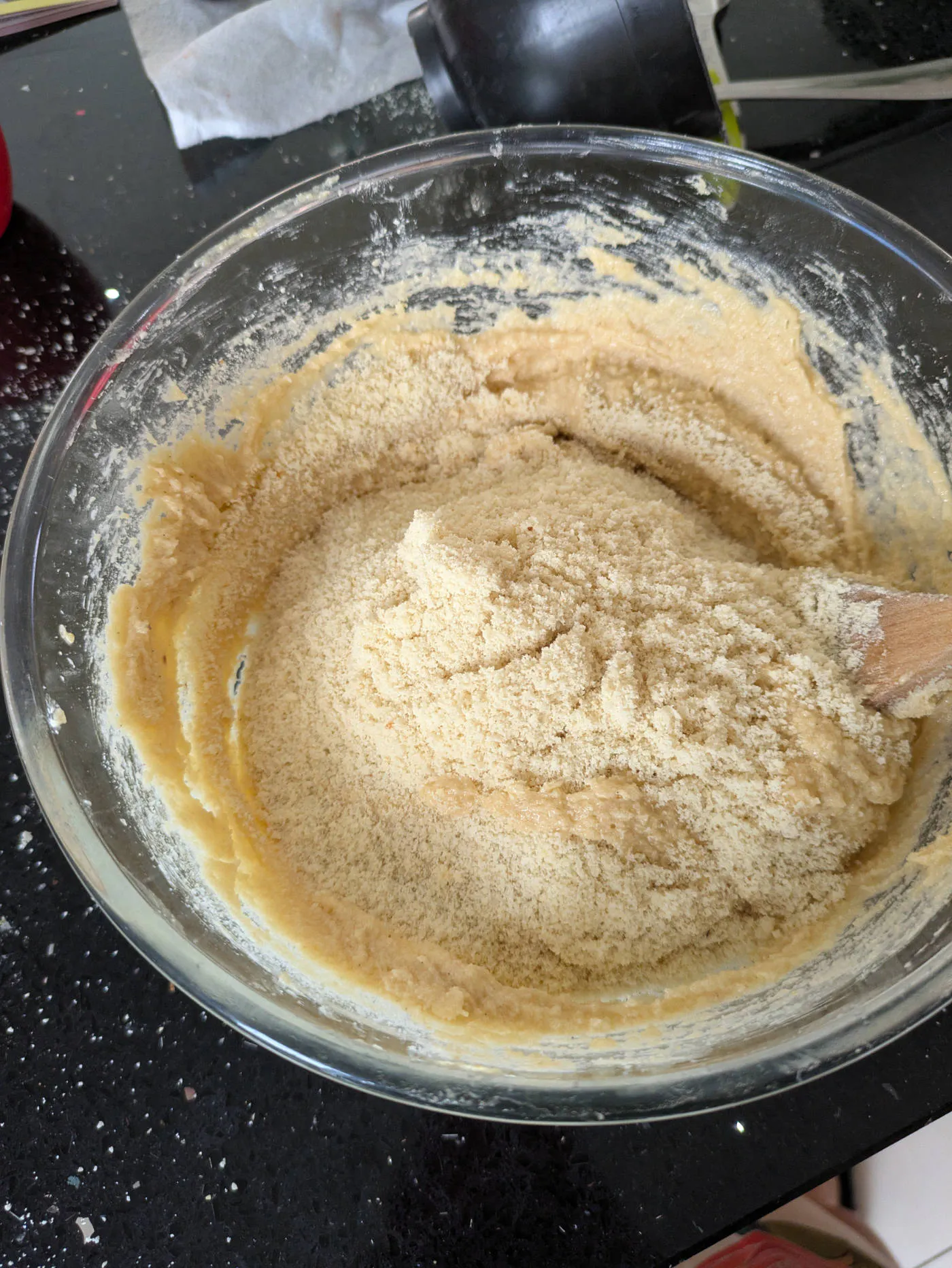 Beat together the butter and sugar until light and fluffy. Whisk/beat in the eggs, lemon zest and vanilla. Fold in the flour and ground almonds. Melt the chocolate over a bain-marie and then fold into the mixture.